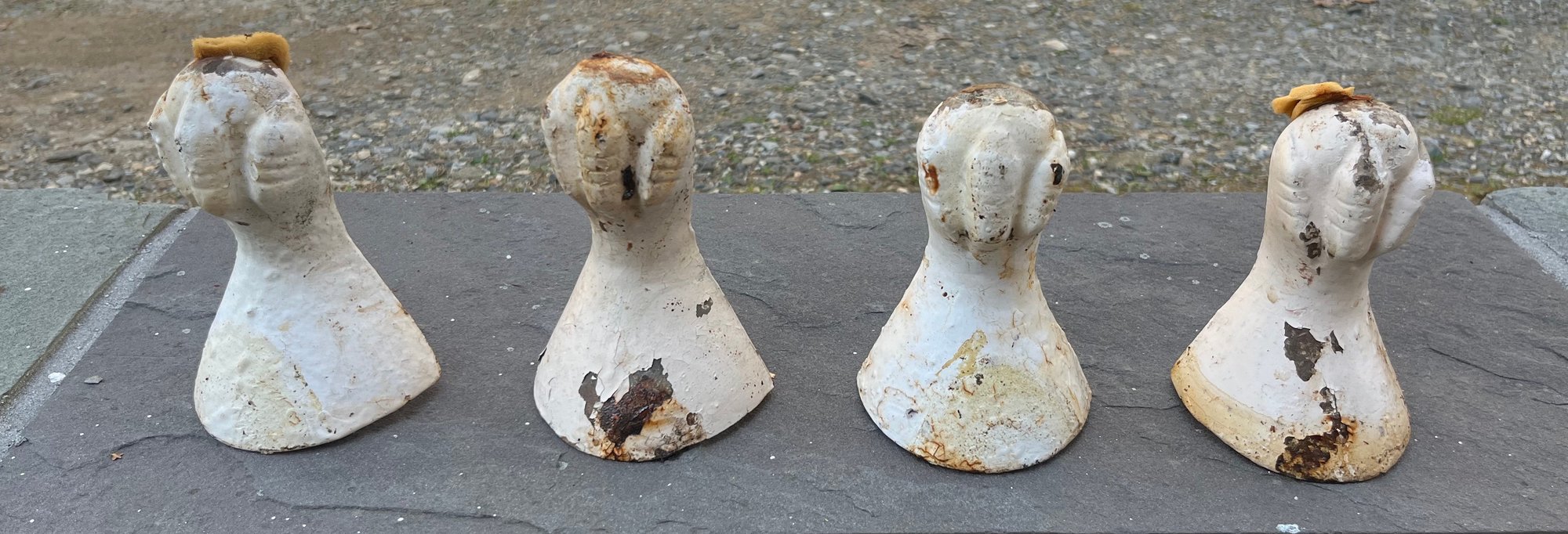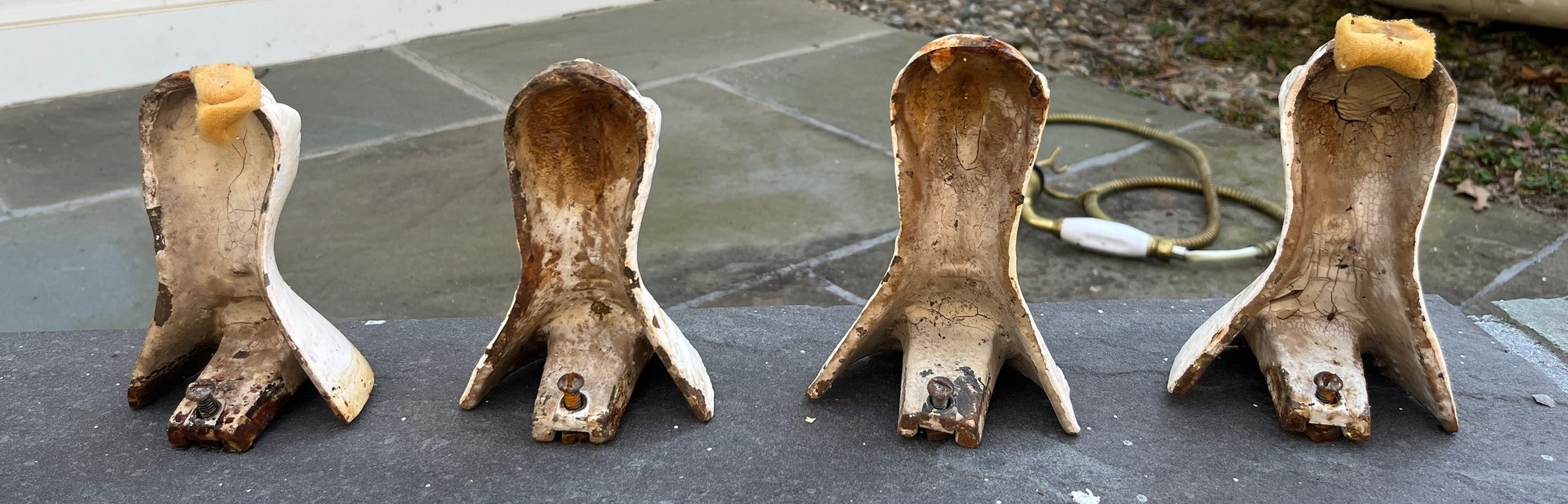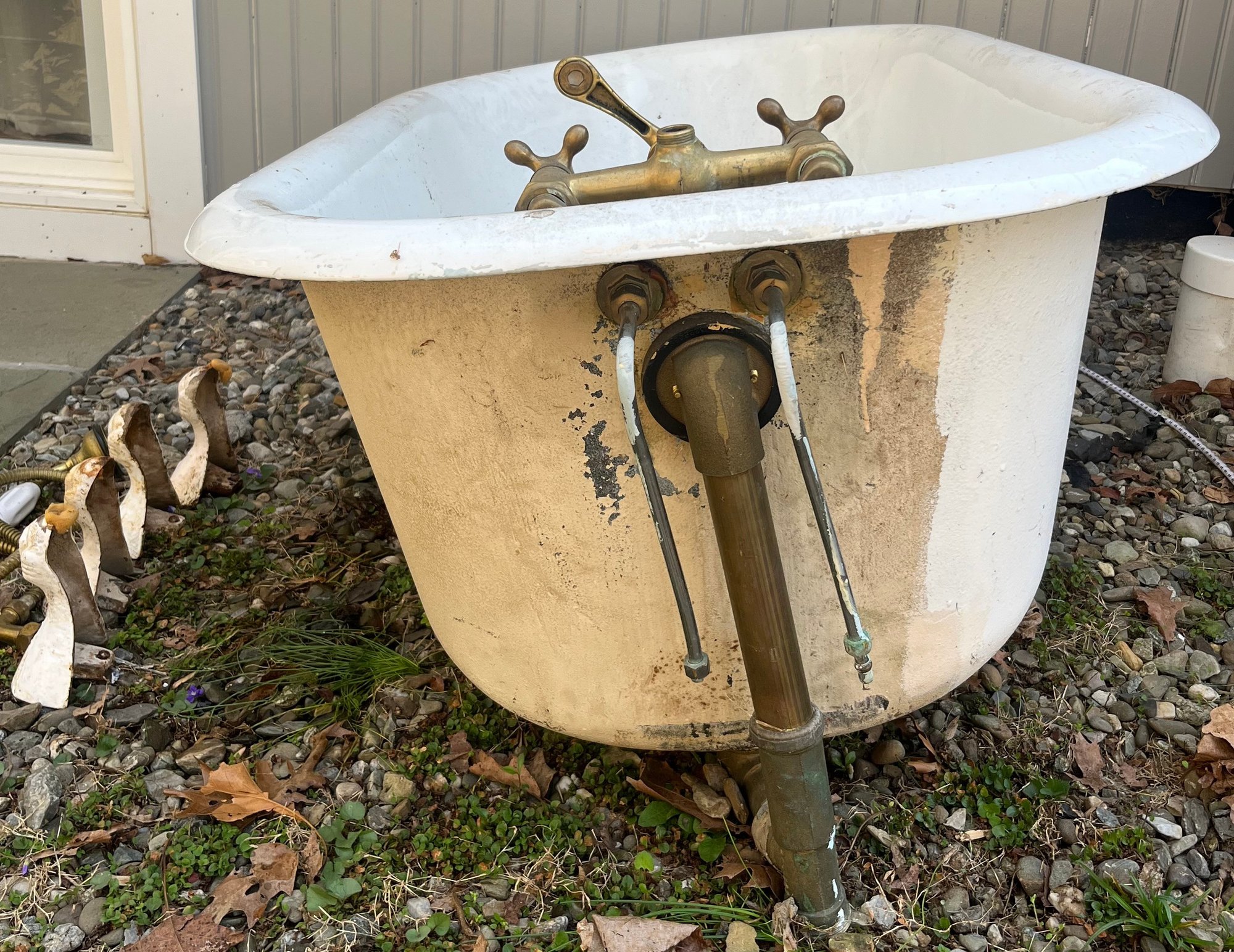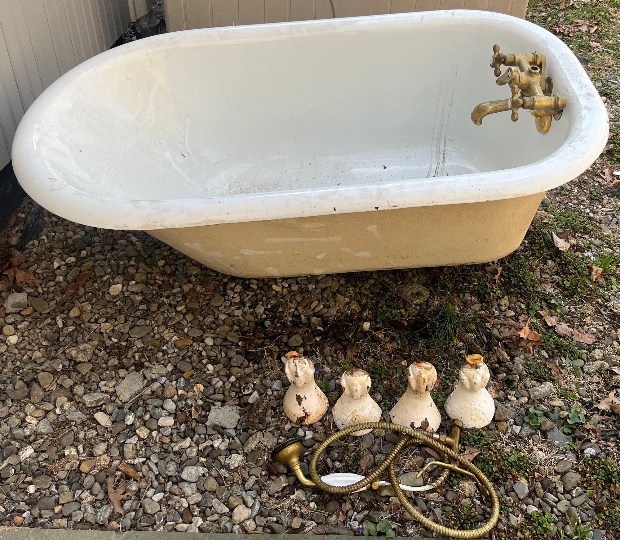 The interior white porcelain enamel retains its structural integrity, showing only the surface crazing, light staining, and minor scratching that a century of use earns honestly. The exterior tells a more weathered story — peeling cream paint revealing raw cast iron beneath, with rust spotting along the lower body — yet this is precisely the canvas a skilled restorer craves. All four original ball-and-claw feet accompany the piece, detached but fully intact in form.