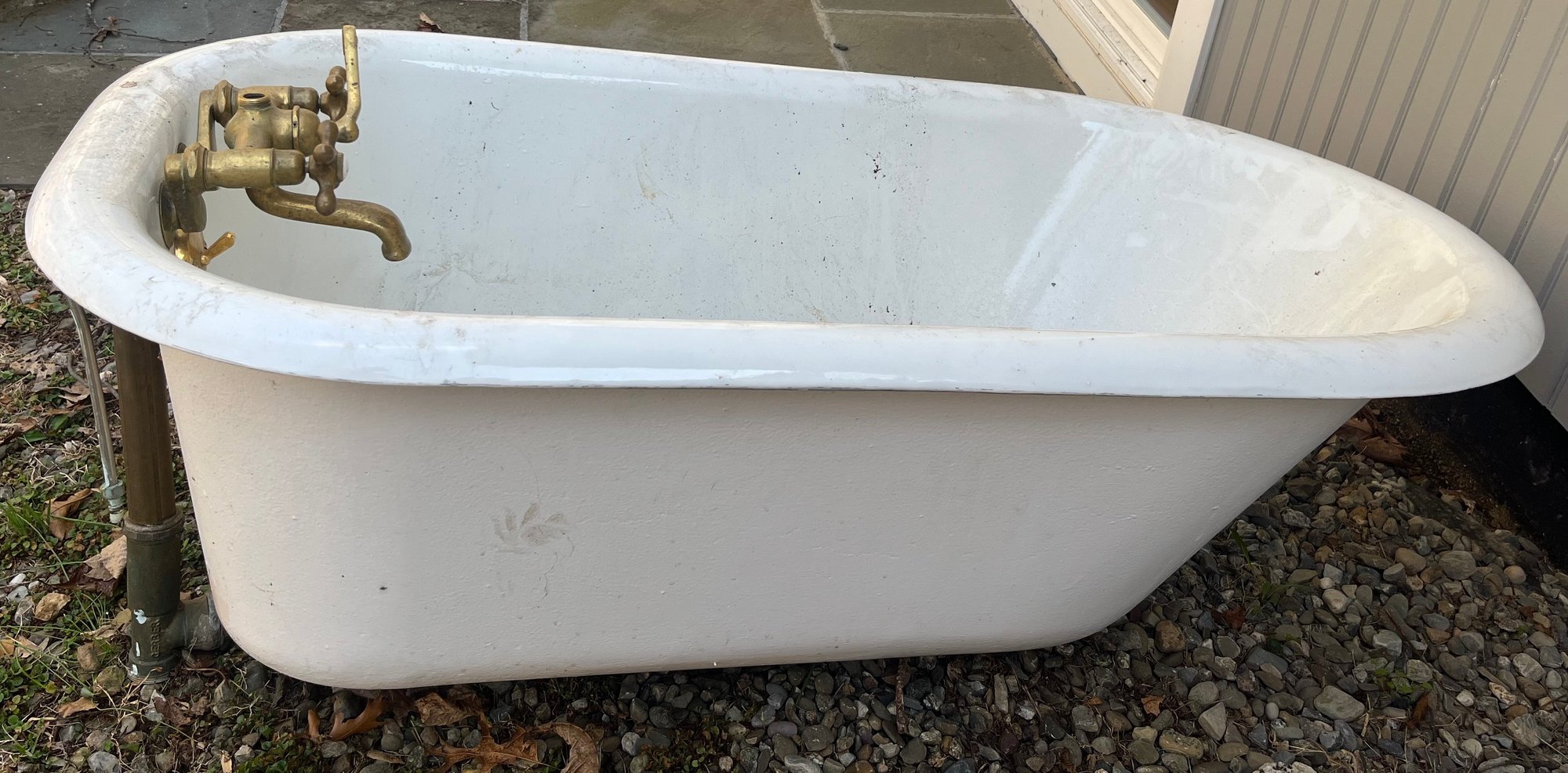 A rare survivor from the golden age of the American bathroom, this cast iron slipper-style clawfoot tub presents a compelling opportunity for the discerning restorer or period interior enthusiast. Consistent with late Victorian to early Edwardian manufacture — circa 1890–1915 — the tub's double-ended silhouette and classically rolled rim speak to an era when the bath was a room of genuine ceremony.