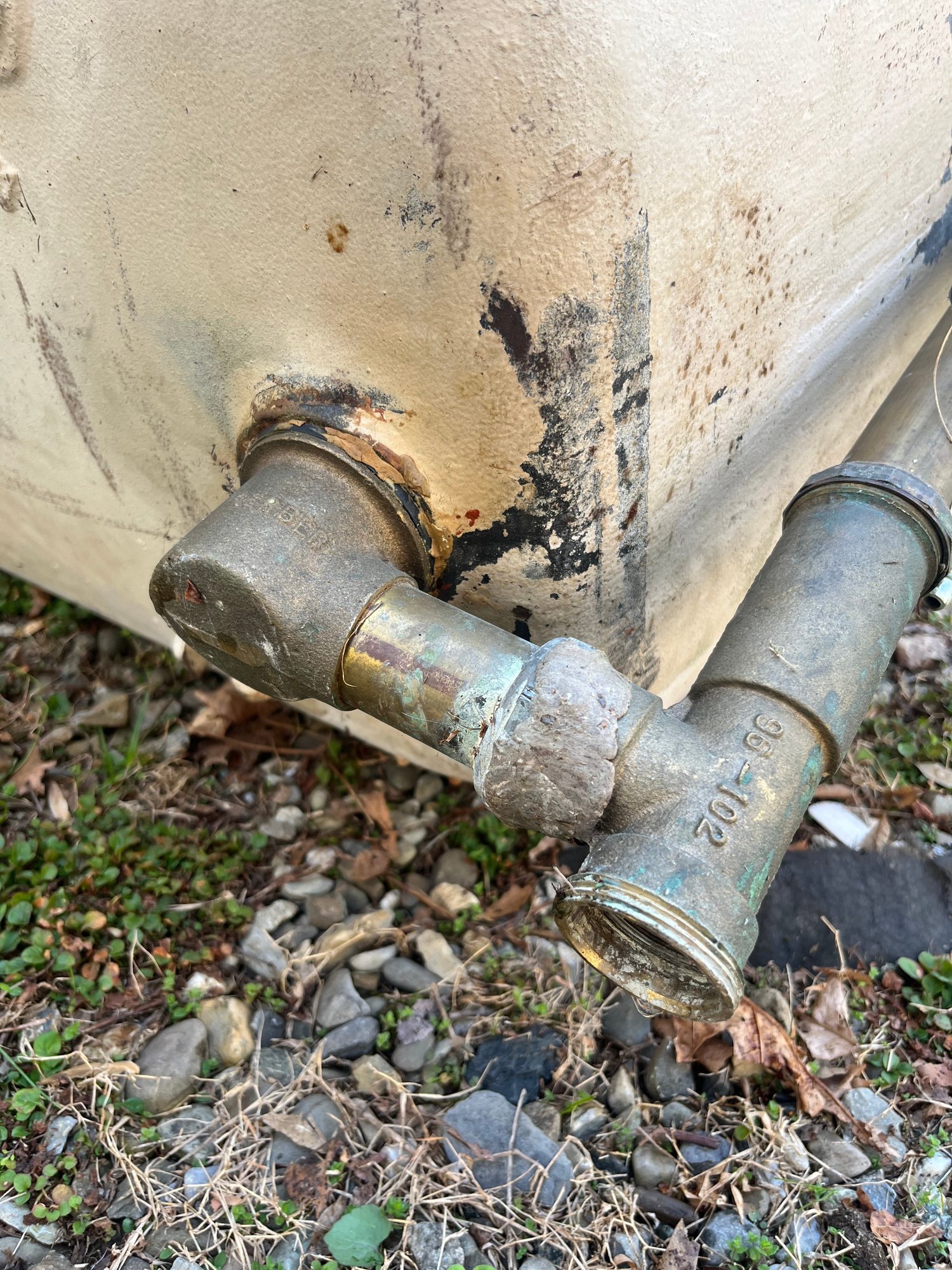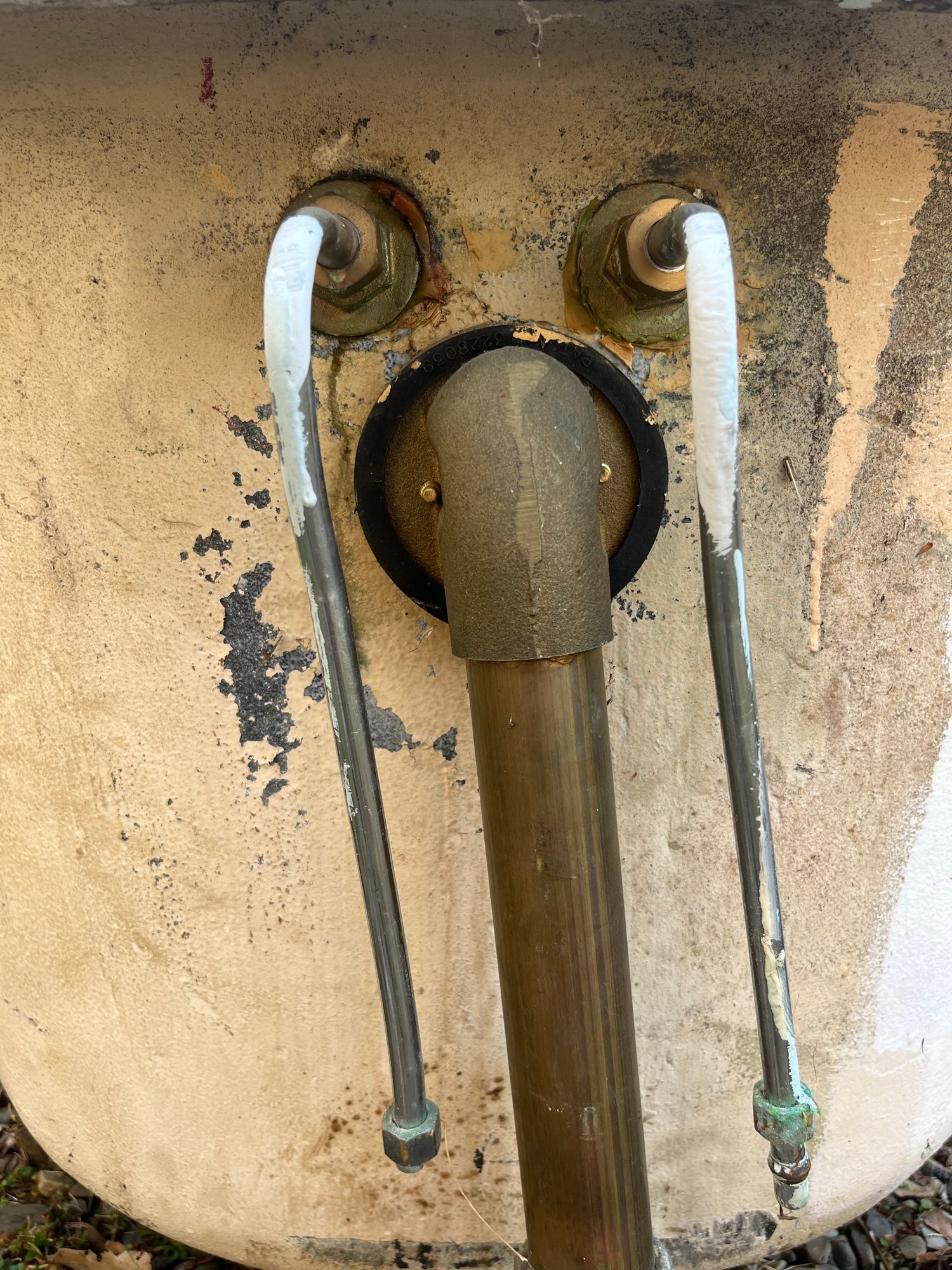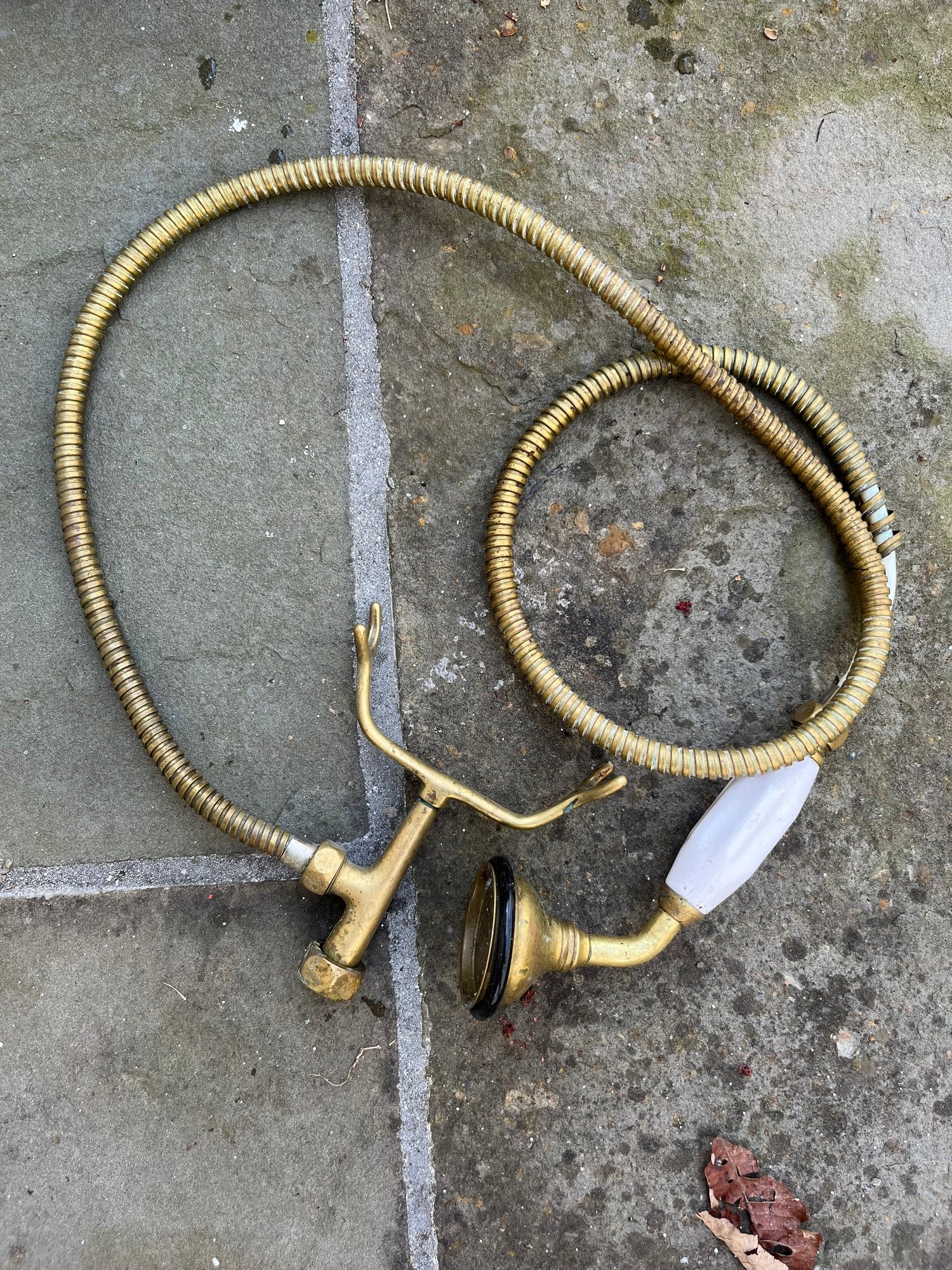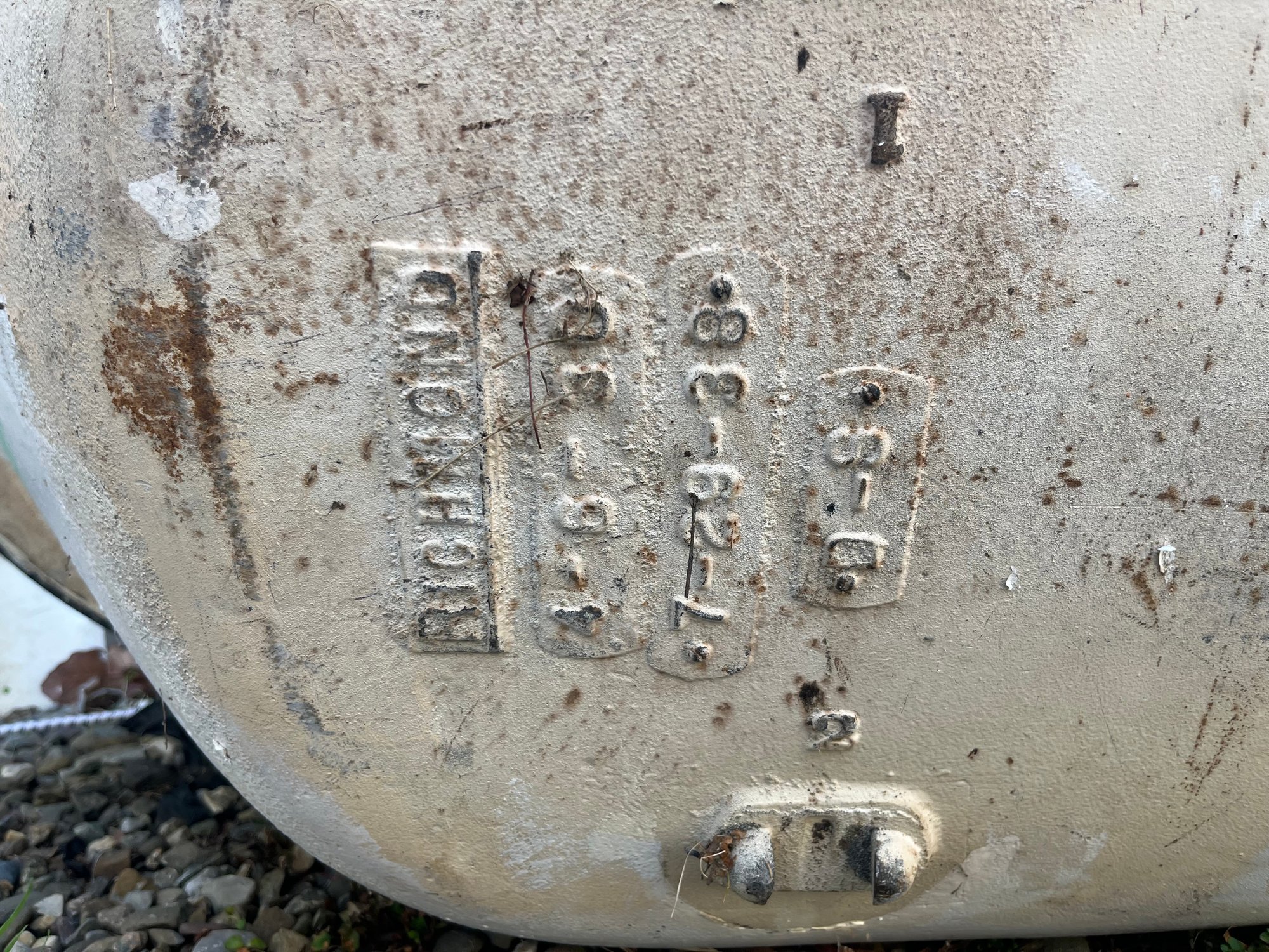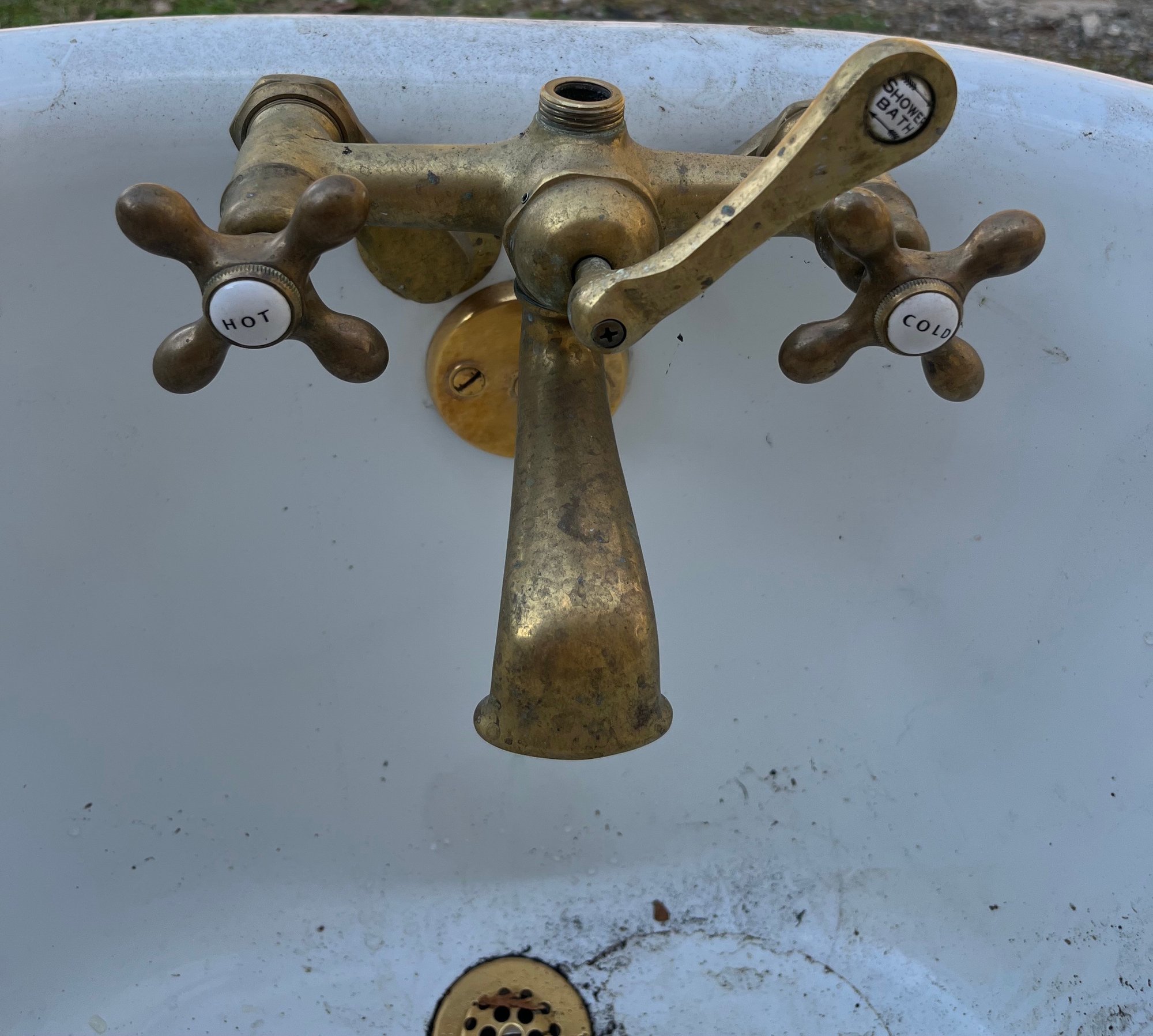 Most remarkably, the original brass deck-mount cross-handle faucet set remains in place, complete with a coiled hand-shower and bell-shaped head — patinated, verdigris-kissed, and irreplaceable. Richmond-marked and historically dated 1930–1938, this is architectural history you can restore.