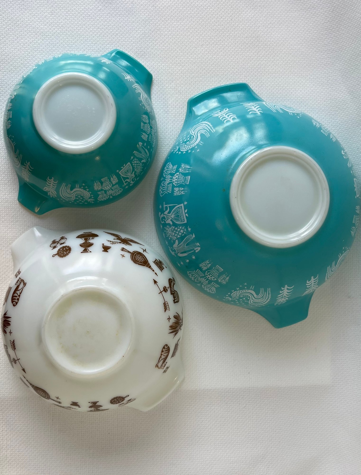 Calling all vintage kitchenware enthusiasts and Pyrex collectors! This exquisite Butterprint Cinderella bowl set in mesmerizing turquoise and white is a true treasure that will elevate any vintage kitchen collection. Preserved in excellent condition, these iconic mid-century pieces showcase the timeless design that has made Pyrex a beloved collectible for generations.