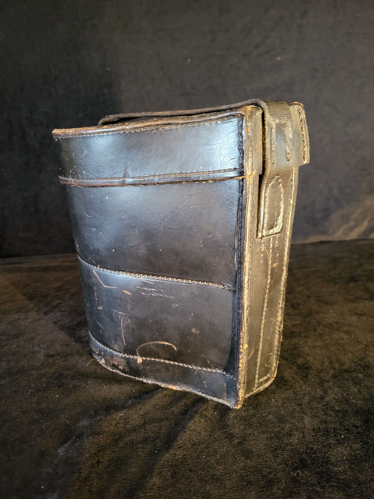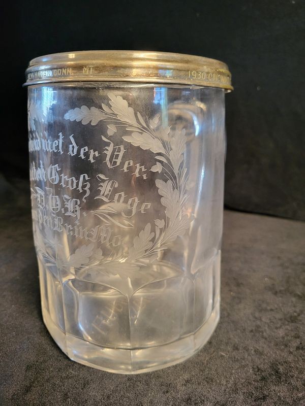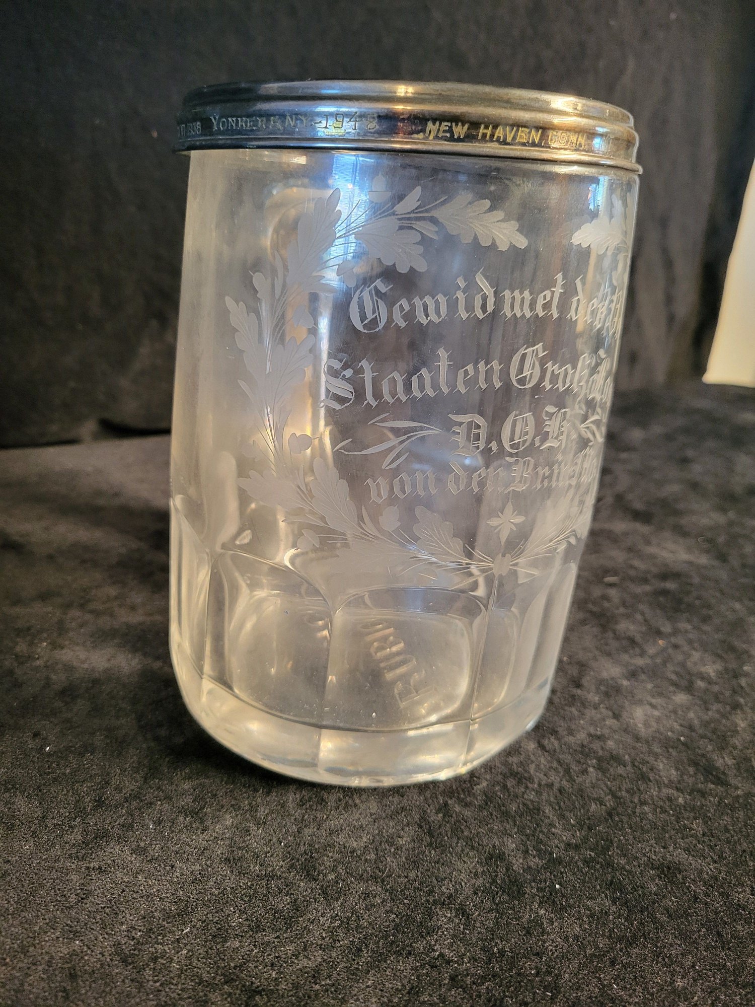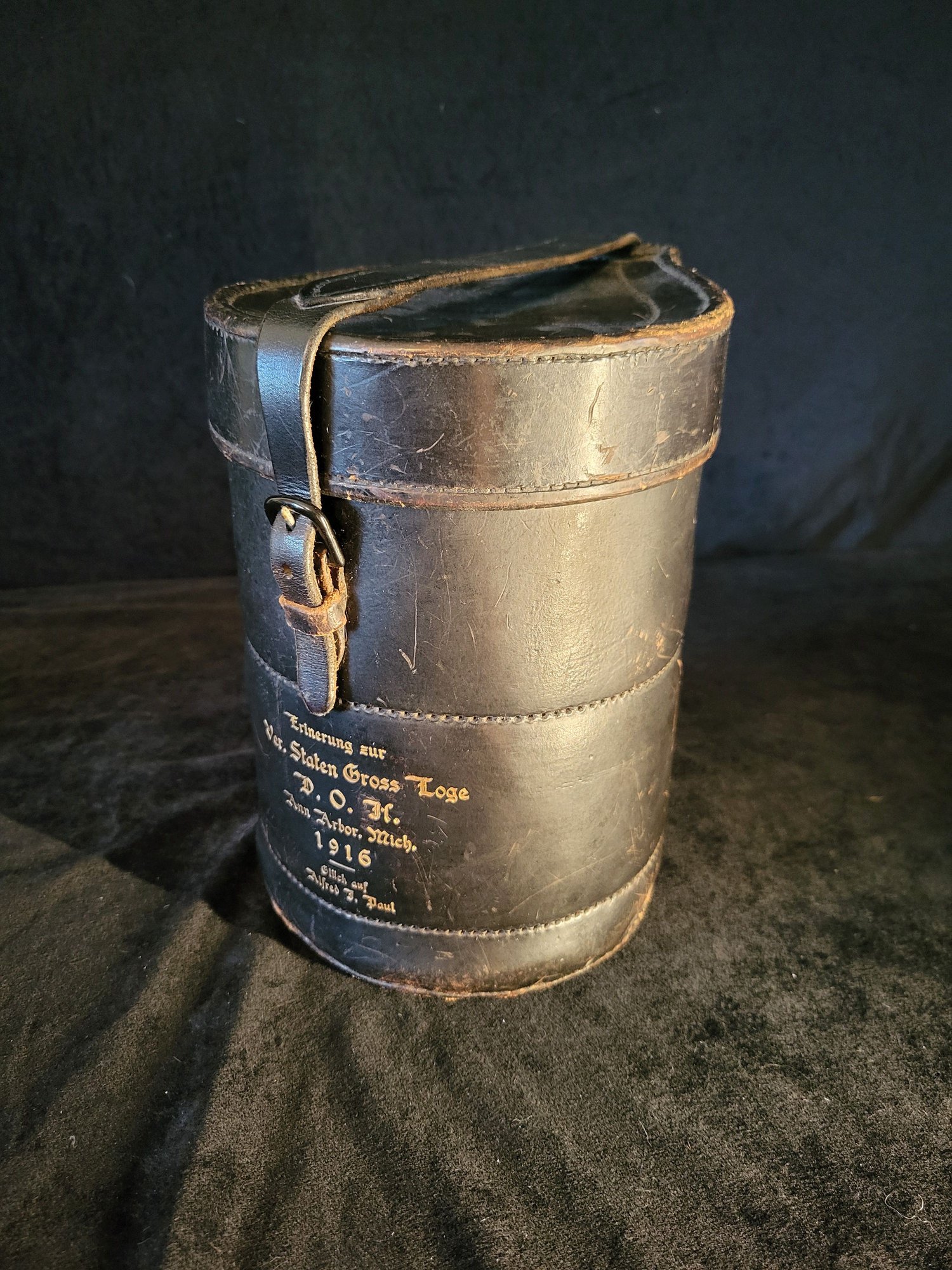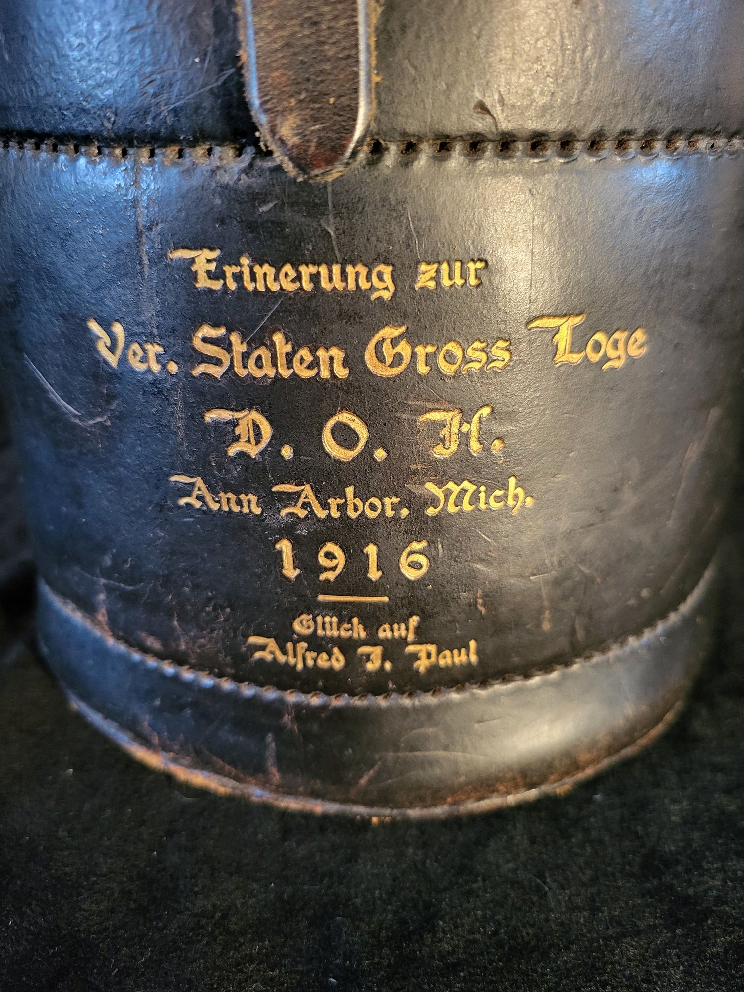 Case inscription: "Erinnerung zur Ver. Staaten Gross Loge D.O.H. Ann Armor, Mich 1916. Glüch auf Alfred J. Paul. Mug inscription: "Gewidmet der Ver. Staten Grok Loge D. O. H. con den Brin MO." Multiple dates and cities also listed around brim of lid and around lid hinge. Leather case has signs of wear, including scratches and scuffs throughout, but is in working order. Inside is clean and lined with felt.