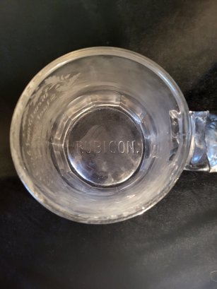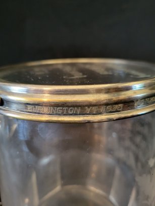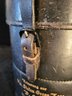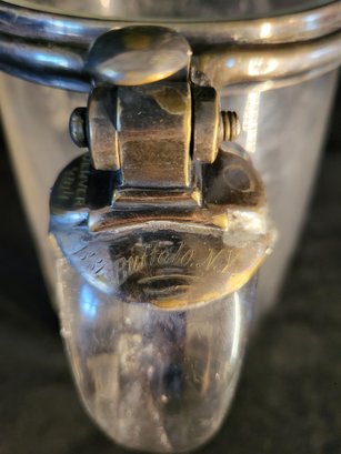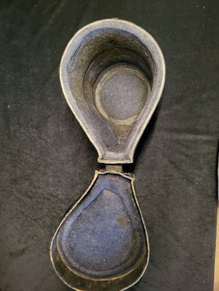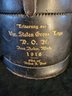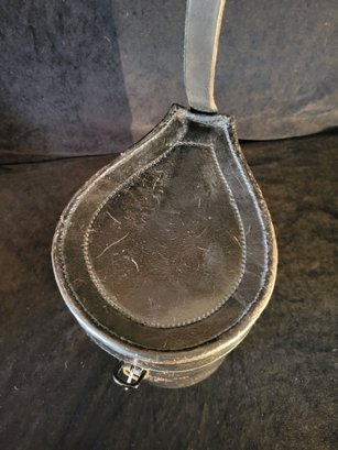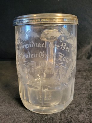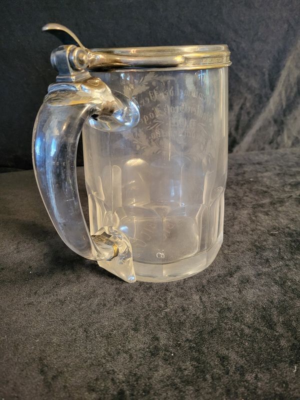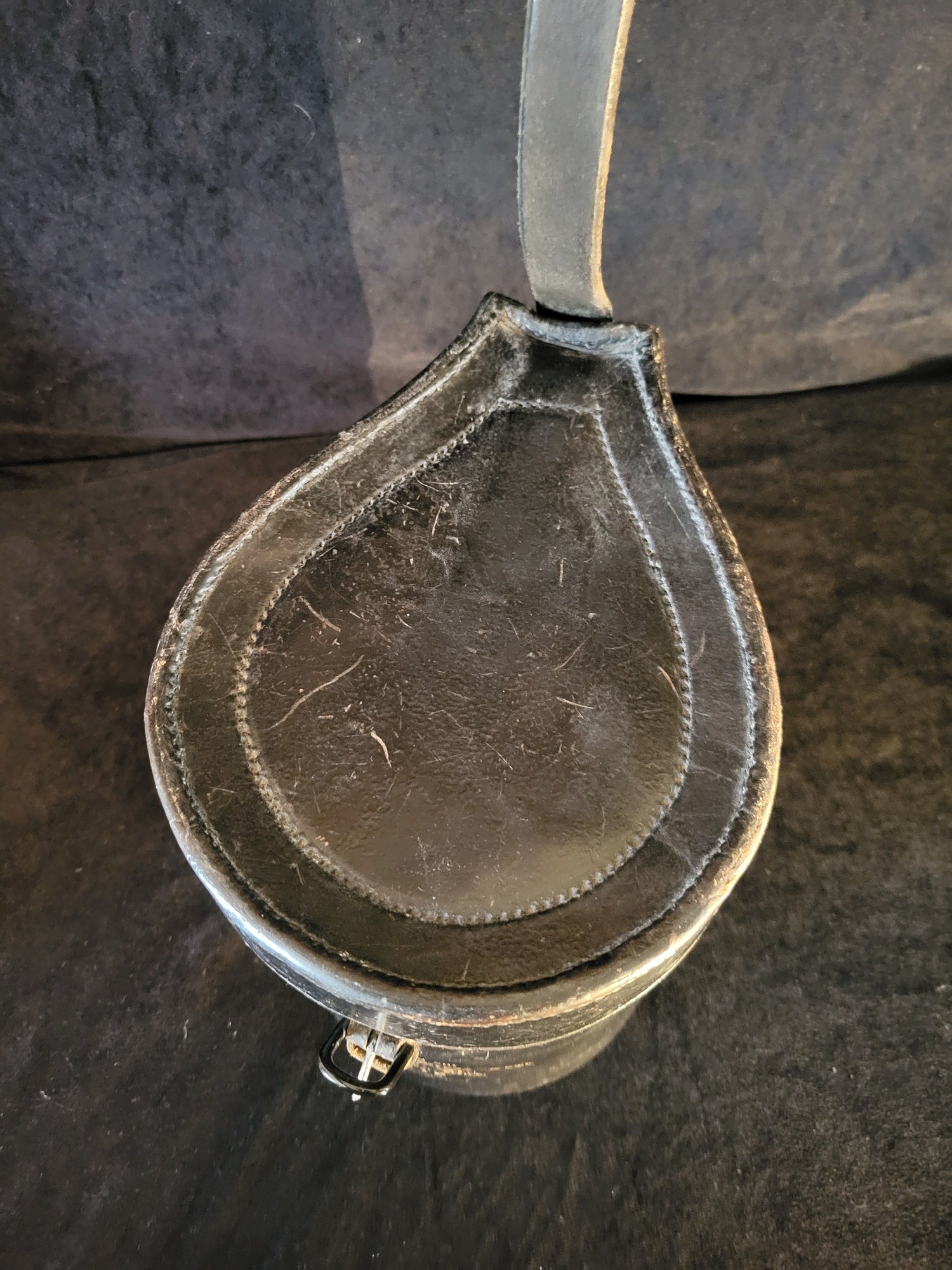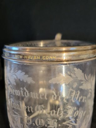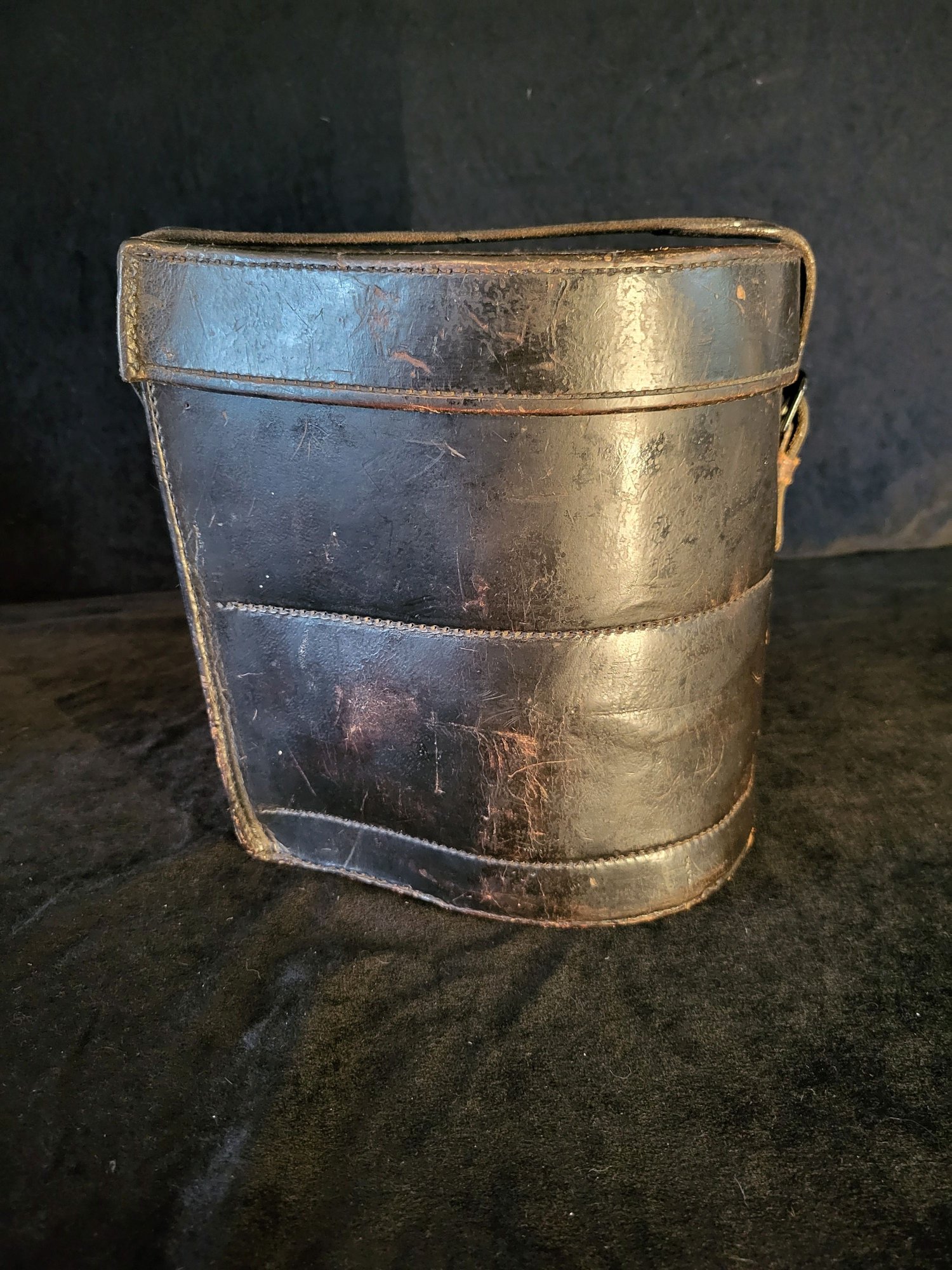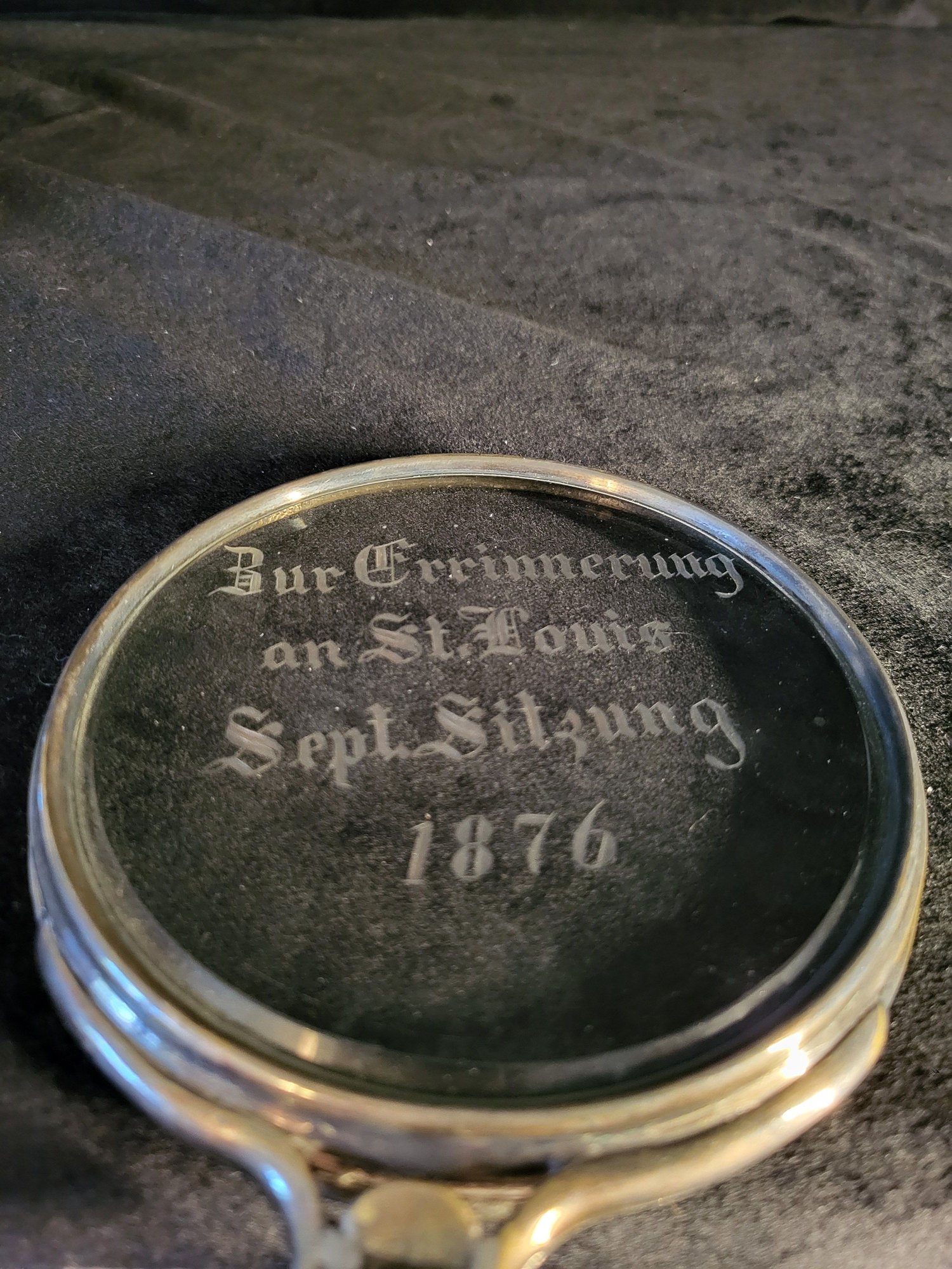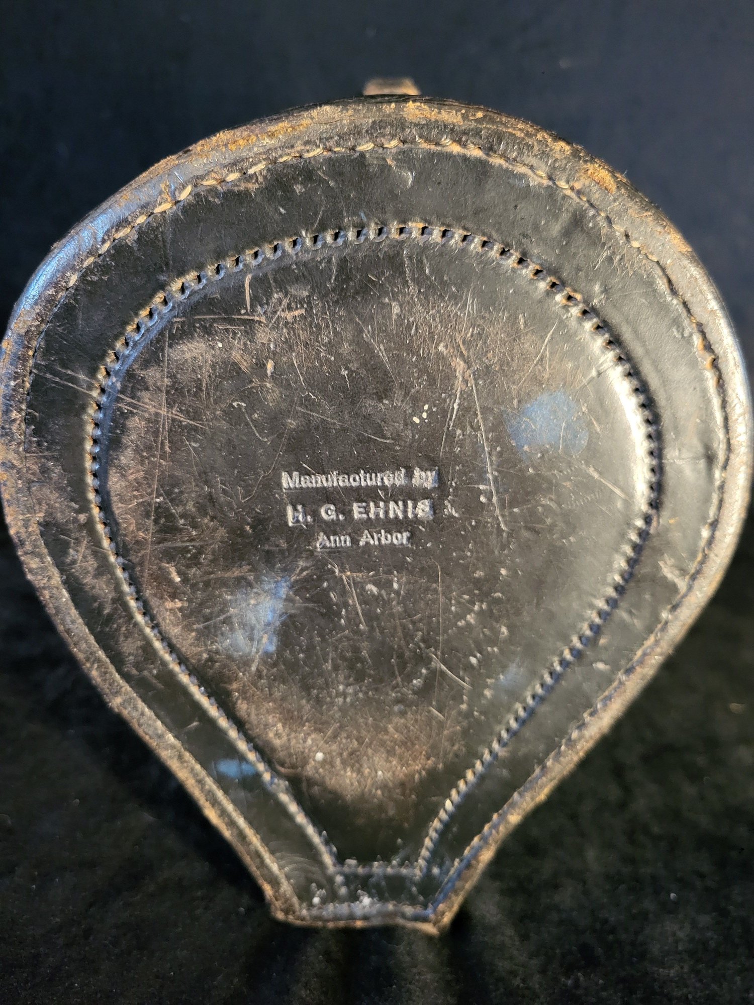 Case inscription: "Erinnerung zur Ver. Staaten Gross Loge D.O.H. Ann Armor, Mich 1916. Glüch auf Alfred J. Paul. Mug inscription: "Gewidmet der Ver. Staten Grok Loge D. O. H. con den Brin MO." Multiple dates and cities also listed around brim of lid and around lid hinge. Leather case has signs of wear, including scratches and scuffs throughout, but is in working order. Inside is clean and lined with felt.