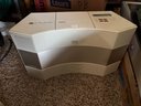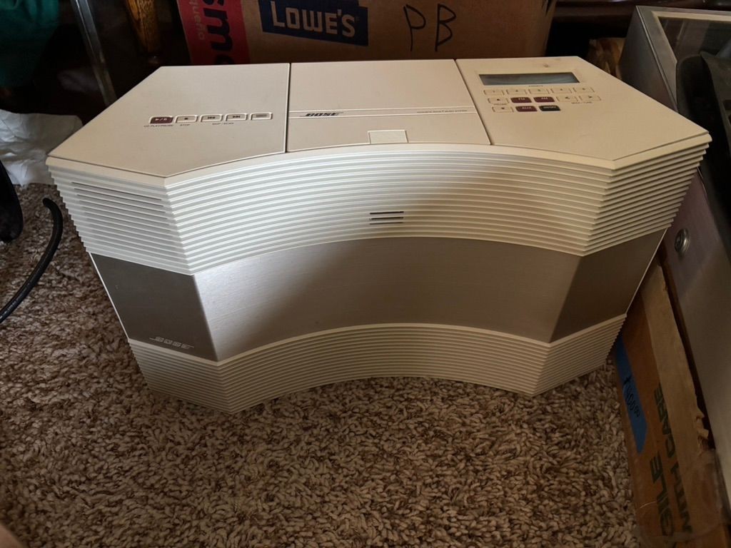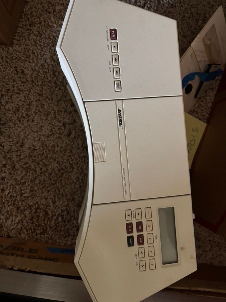 Creamy white radio, cd player. It has been tested and it works. It comes with remote control and manual.