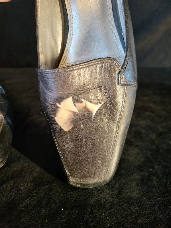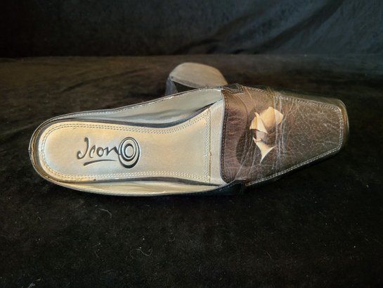 Depicts two figures kissing on front of shoe. Icon label on heel.