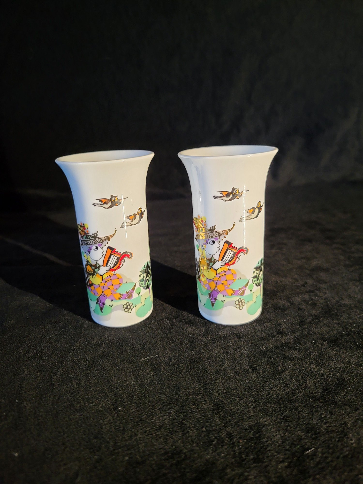 Set of two. Made by Rosenthal, in Germany. Signed by Bjorn Wiinblad. Both pieces are identical with the exception of one having a "22" lightly embossed on the base.