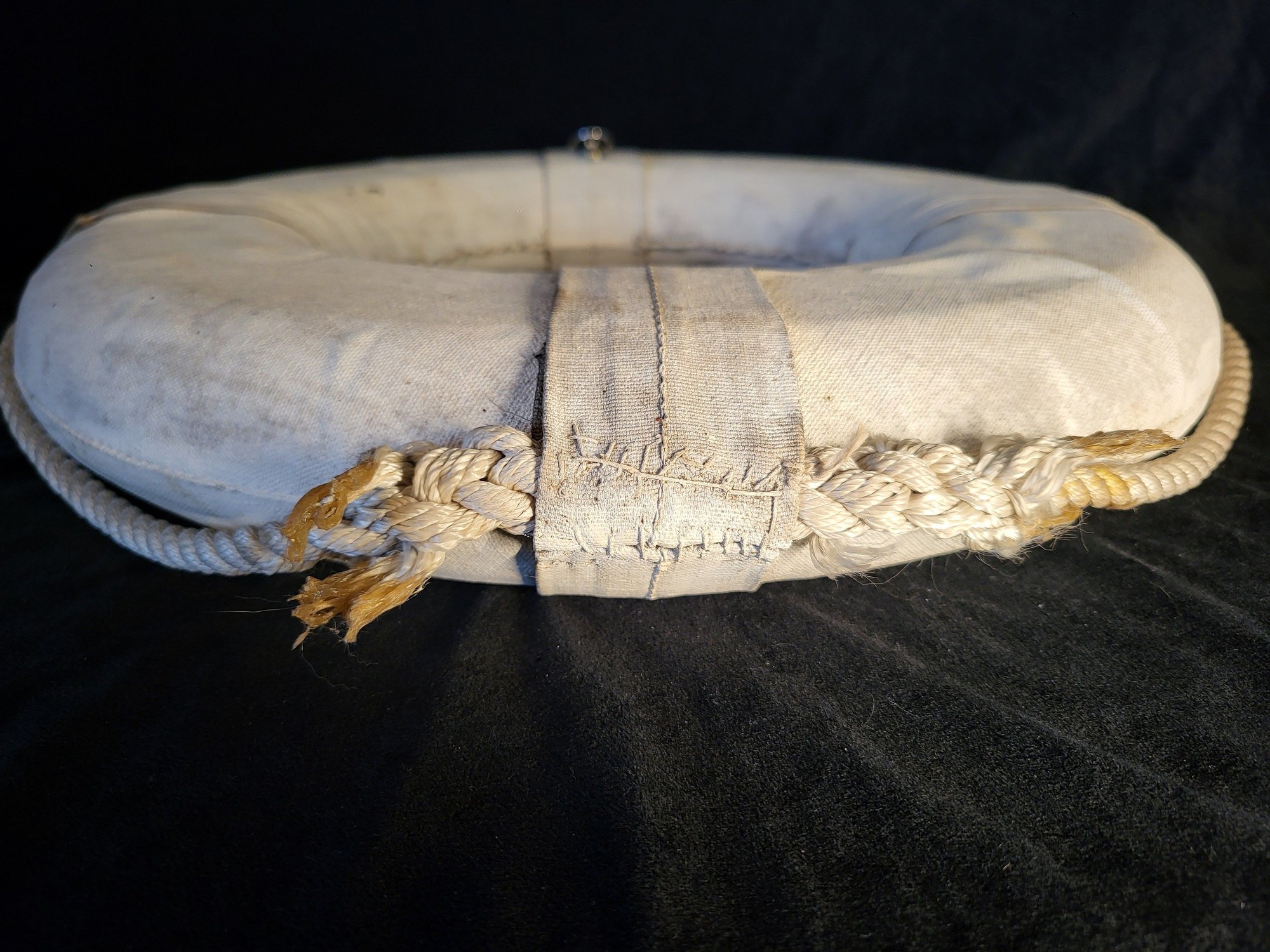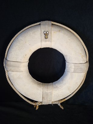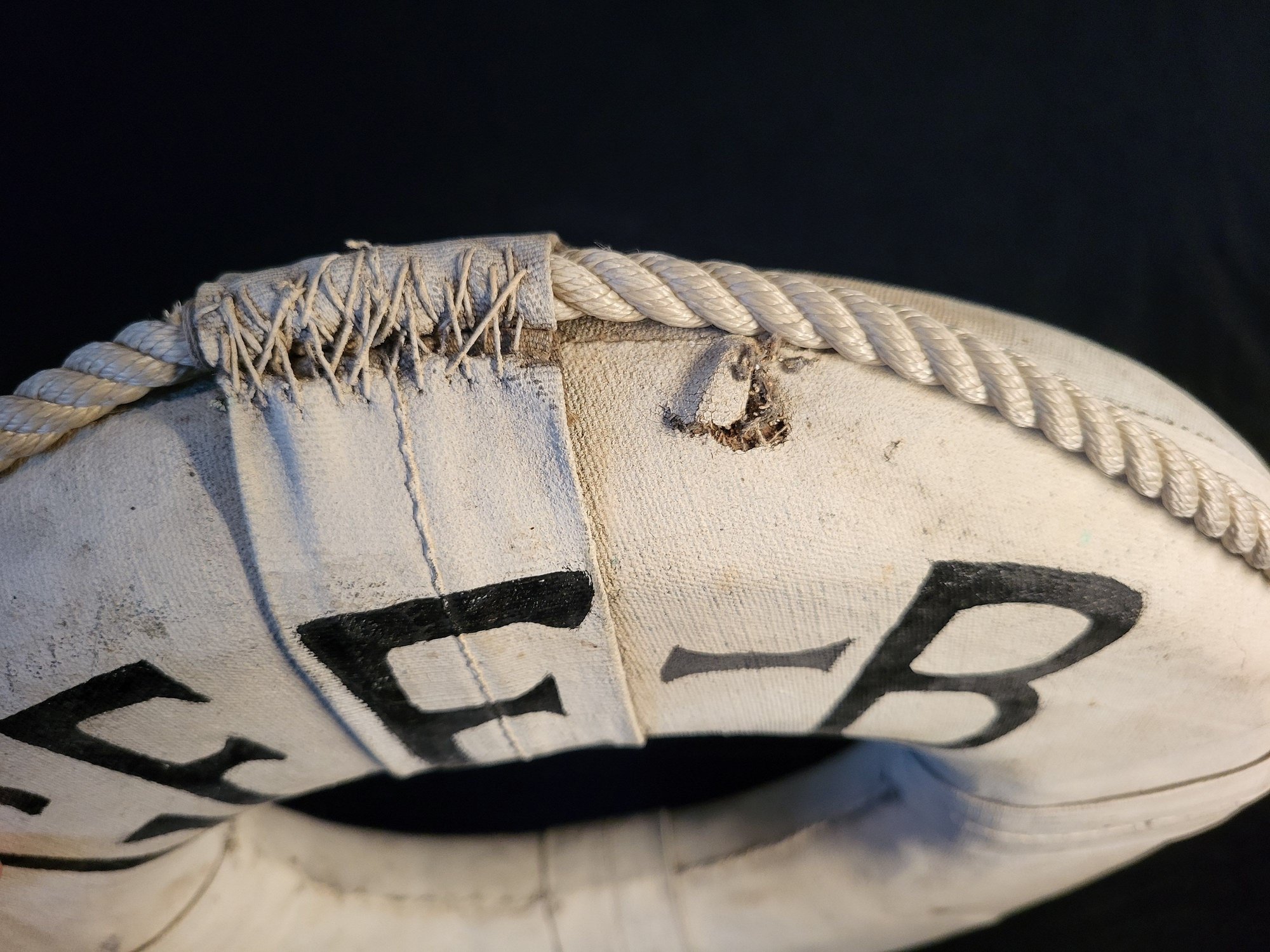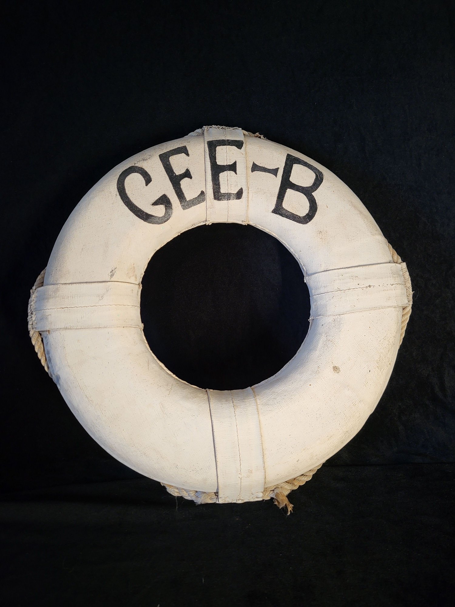 Large rustic life preserver with "Gee-B" painted on front. Made of canvas and rope. Rope attached around circumference. Wall hanger on back. Discoloration around ends of rope at bottom. Small hole on top.