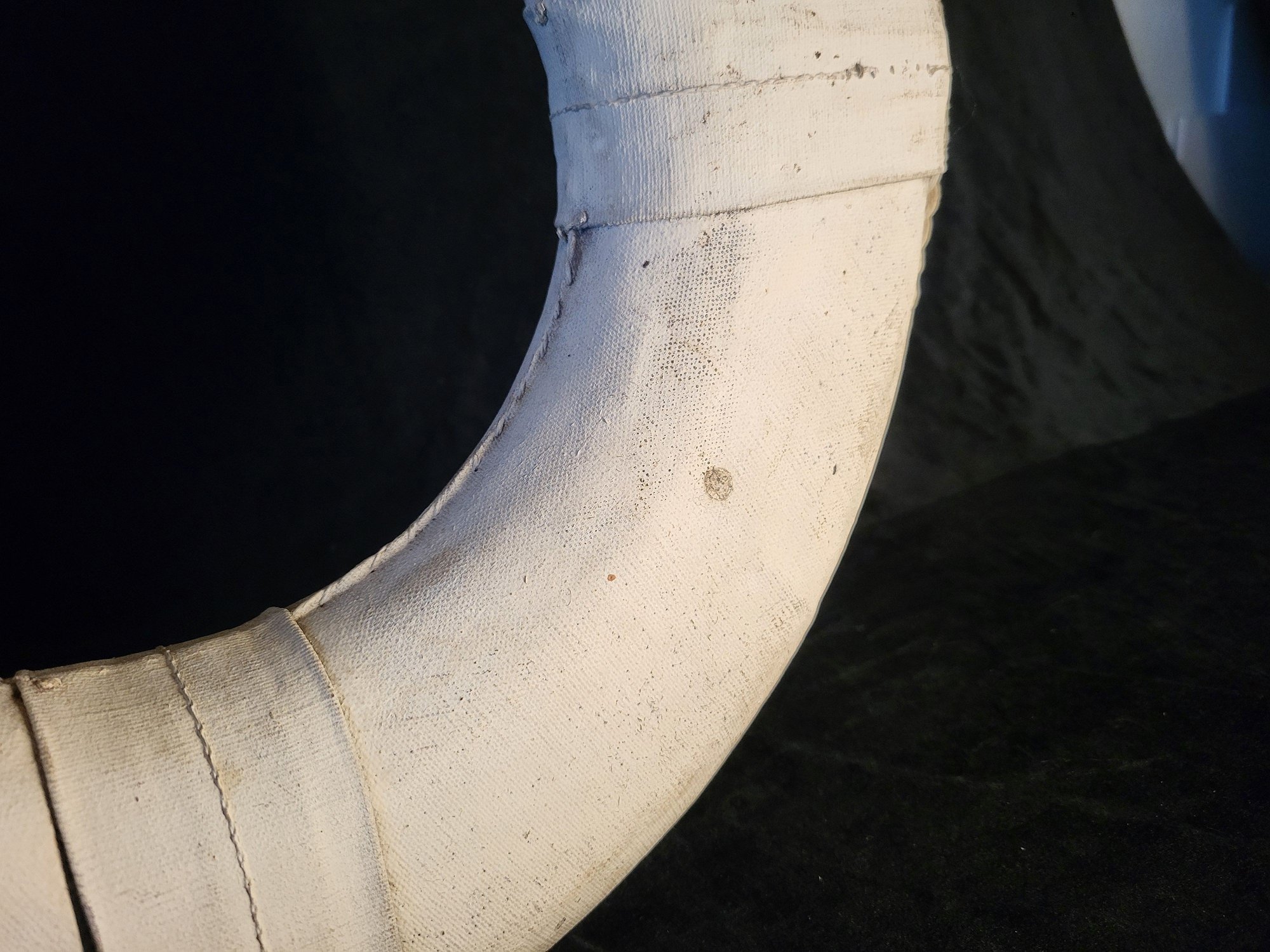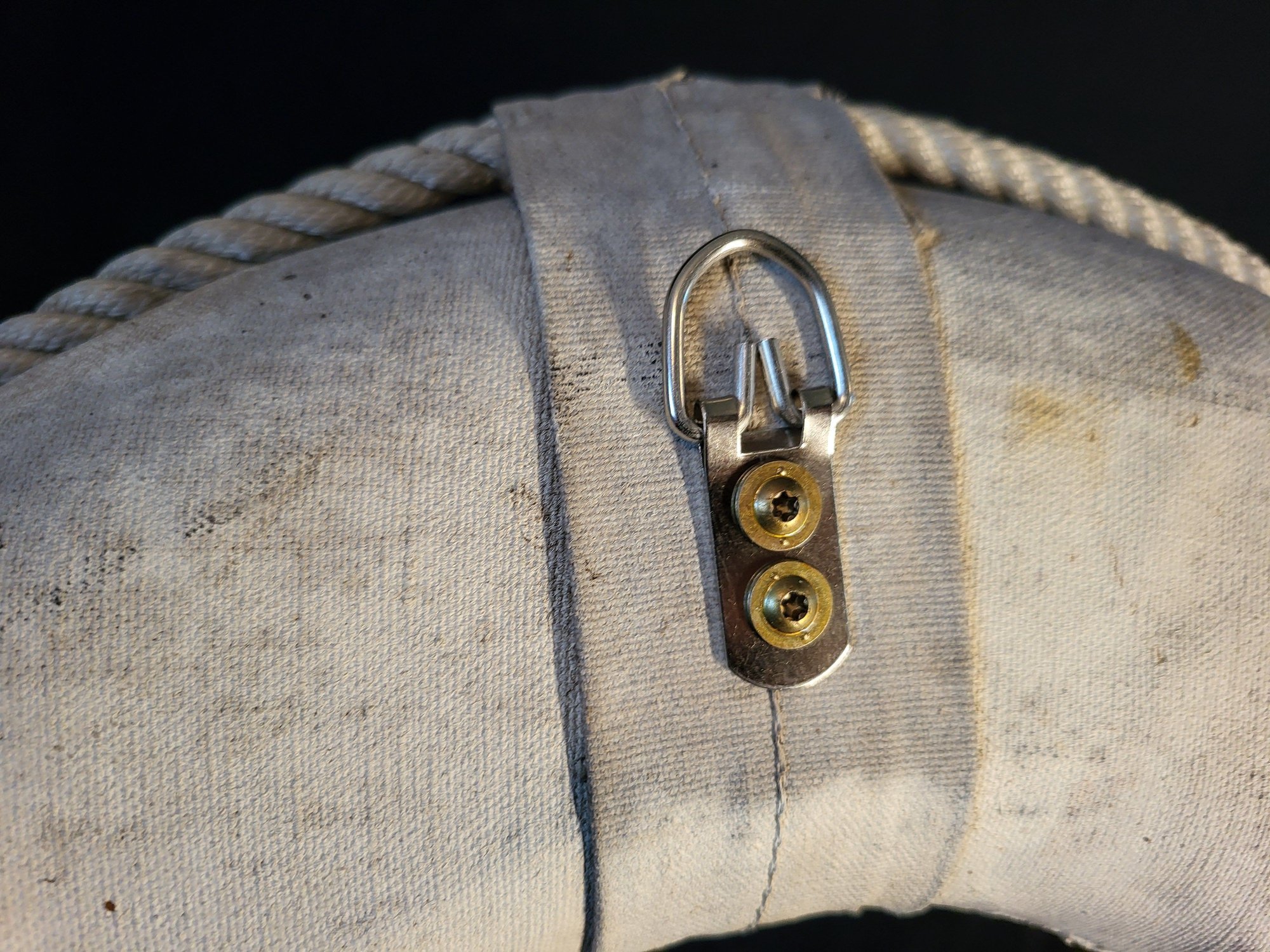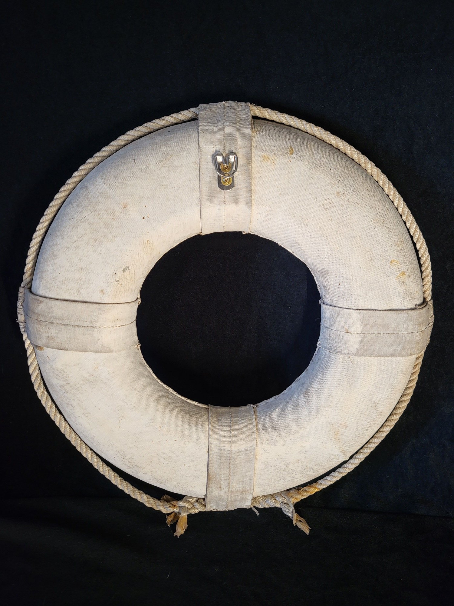 Large rustic life preserver with "Gee-B" painted on front. Made of canvas and rope. Rope attached around circumference. Wall hanger on back. Discoloration around ends of rope at bottom. Small hole on top.