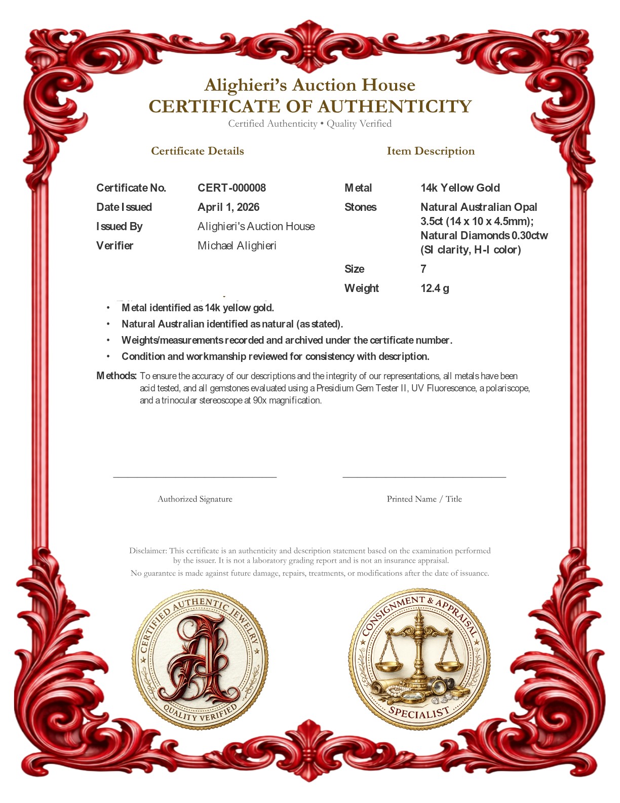Welcome to Alighieri's Auction House and our fine jewelry, gemstones, luxury, and collectible auctions. Please read the following terms carefully before bidding. By registering and/or placing a bid, you acknowledge and agree to all terms below.