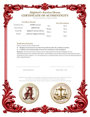 Welcome to Alighieri's Auction House and our fine jewelry, gemstones, luxury, and collectible auctions. Please read the following terms carefully before bidding. By registering and/or placing a bid, you acknowledge and agree to all terms below.
