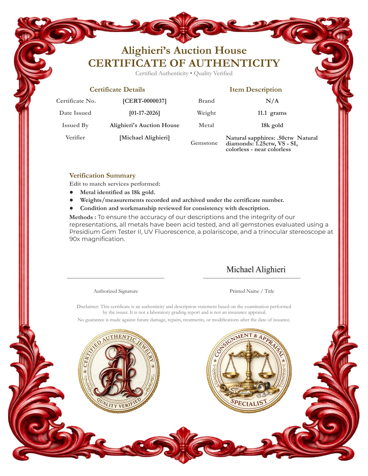Welcome to Alighieri's Auction House and our fine jewelry, gemstones, luxury, and collectible auctions. Please read the following terms carefully before bidding. By registering and/or placing a bid, you acknowledge and agree to all terms below.