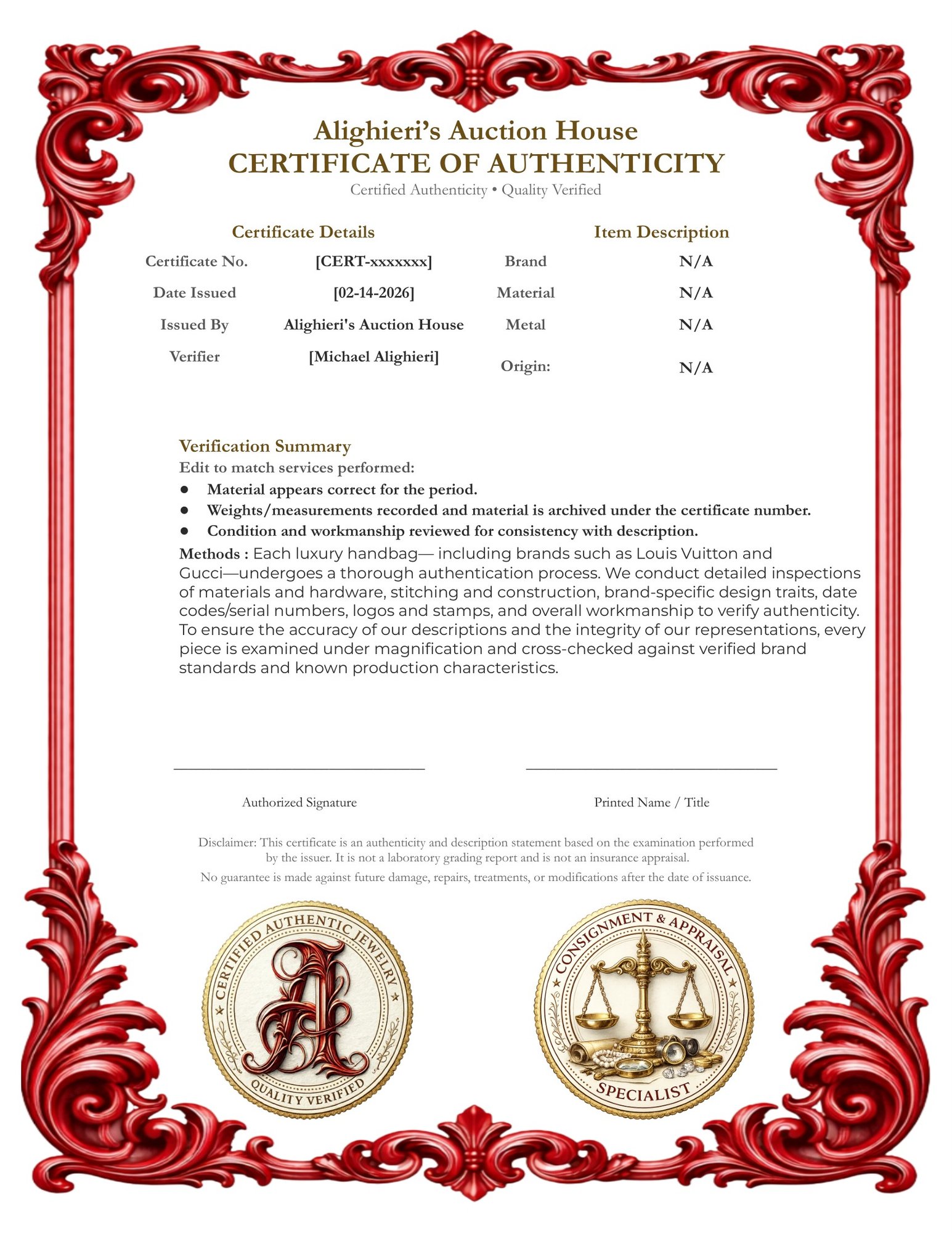 Welcome to Alighieri's Auction House and our fine jewelry, gemstones, luxury, and collectible auctions. Please read the following terms carefully before bidding. By registering and/or placing a bid, you acknowledge and agree to all terms below.