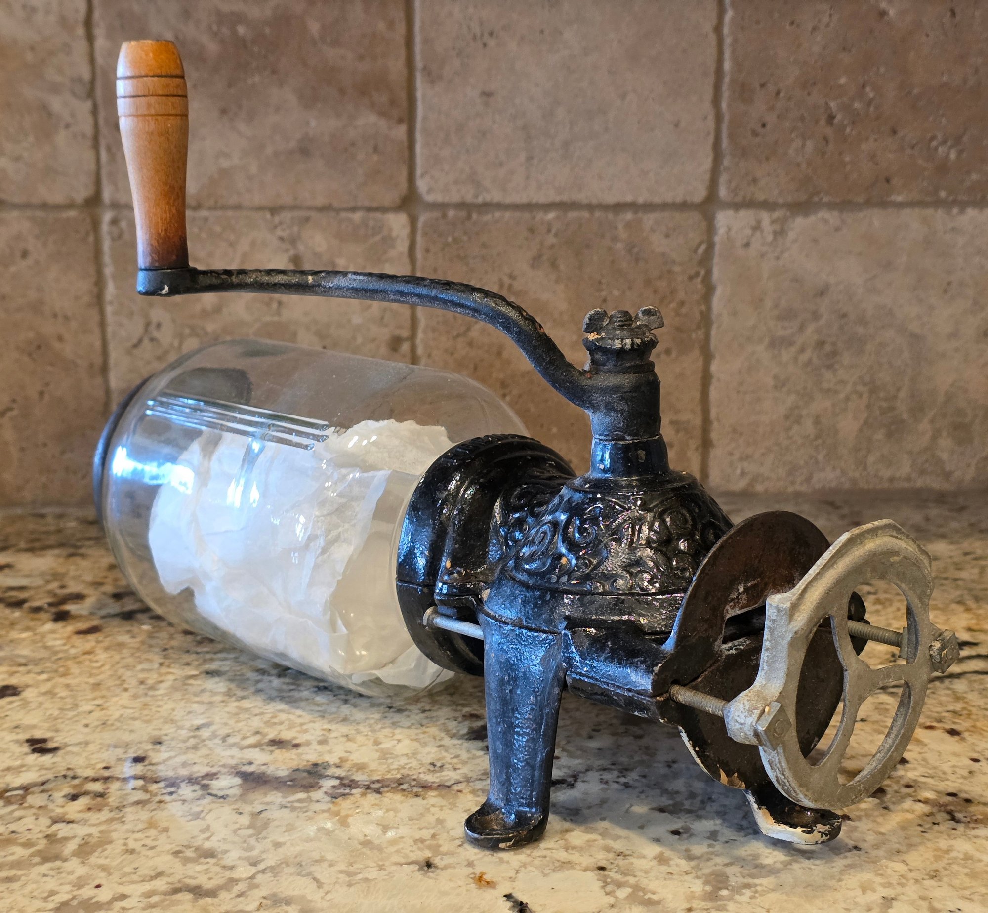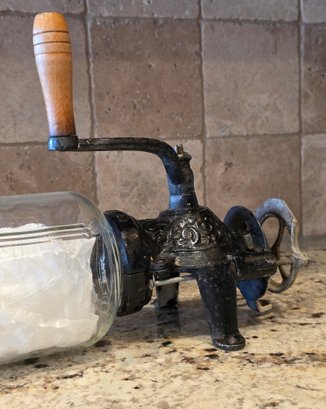 Designed to be mounted to a wall and typically includes a catch cup (often missing in antique listings) for the ground coffee.