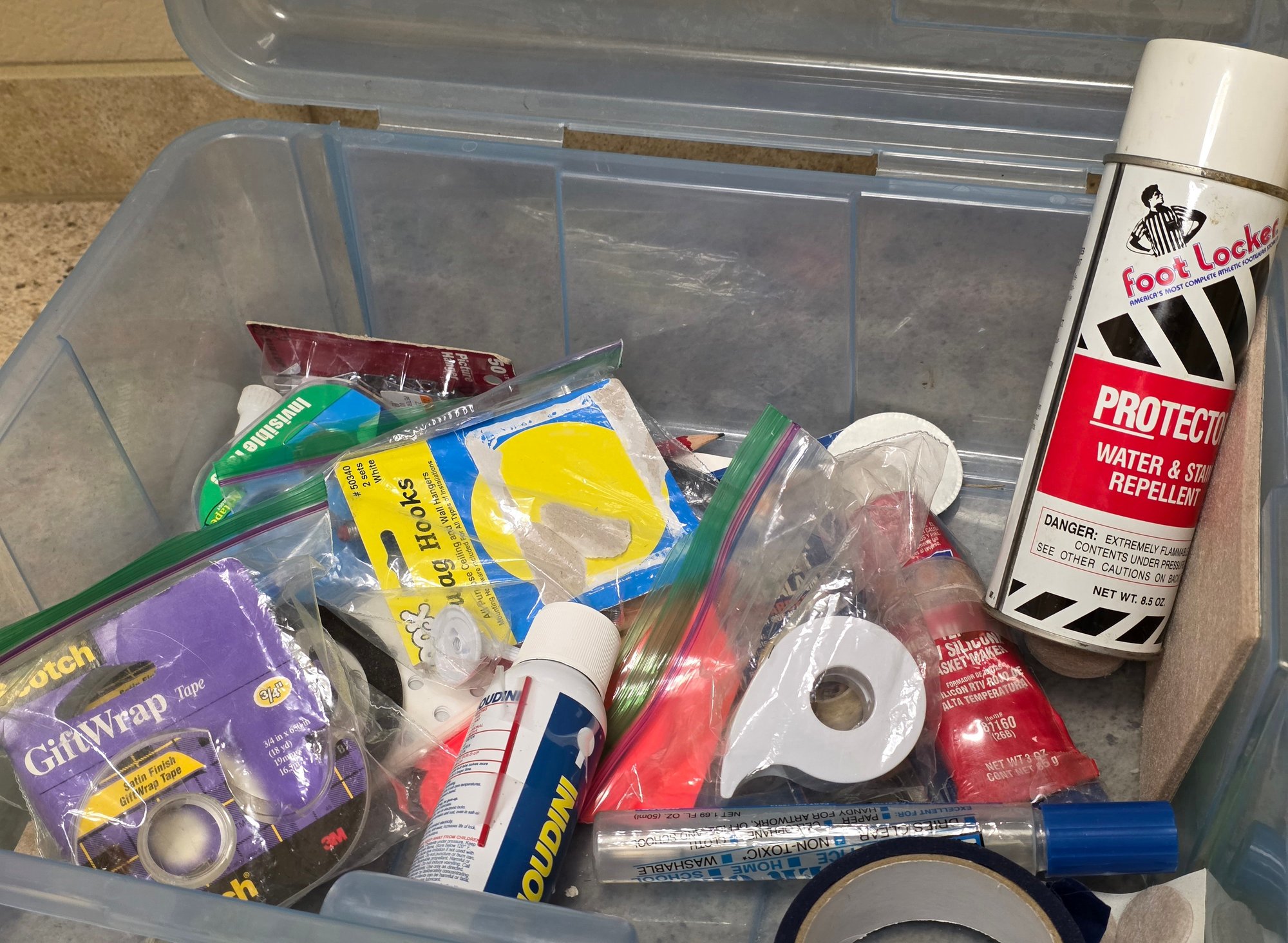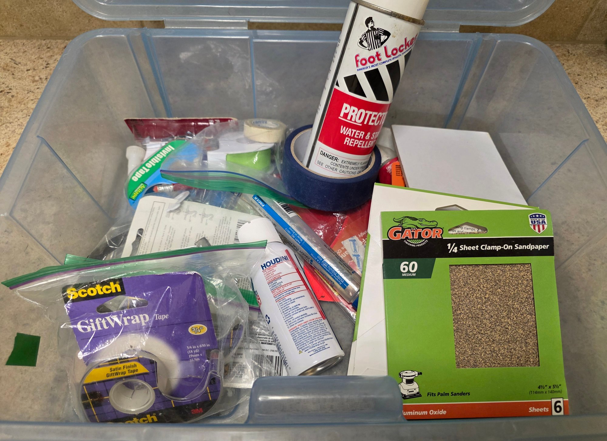 Clear Plastic Storage Container Filled With Various Household And Craft Supplies
