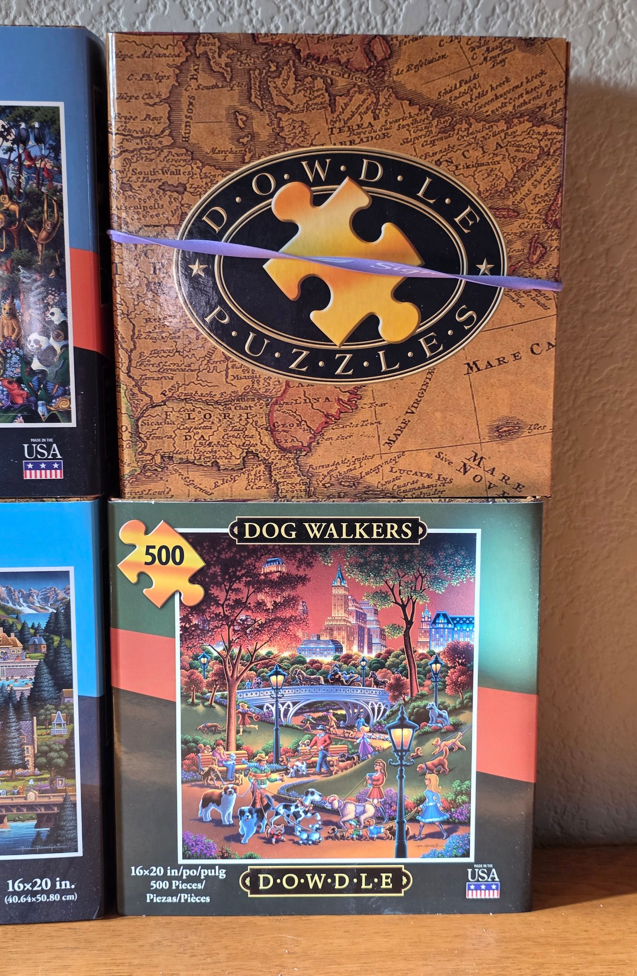 Noah's Ark Puzzle: A 500-piece puzzle featuring a colorful folk art depiction of Noah's Ark, finished size (16times 20) inches. Dog Walkers Puzzle: A 500-piece puzzle depicting city scenes with dogs and their owners, finished size (16times 20) inches. Banff Puzzle: A 500-piece puzzle depicting the scenic Canadian town of Banff, finished size (16times 20) inches. London Puzzle: A 1000-piece puzzle featuring Dowdle Folk Art's interpretation of London landmarks.