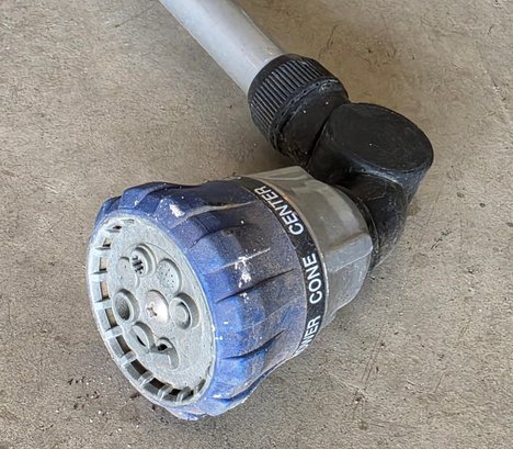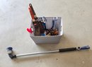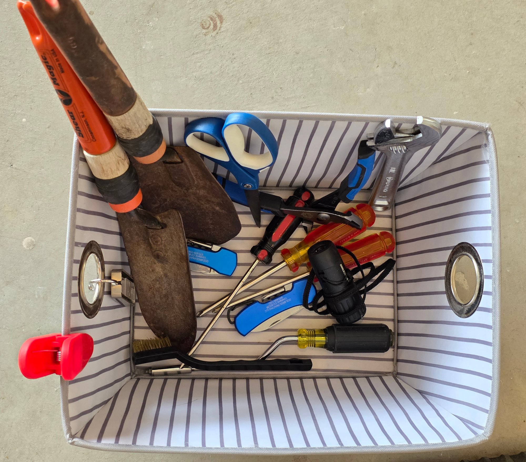 Fabric Storage Bin Used For Gardening Tool Organization, Along With A Long-handled Watering Wand