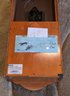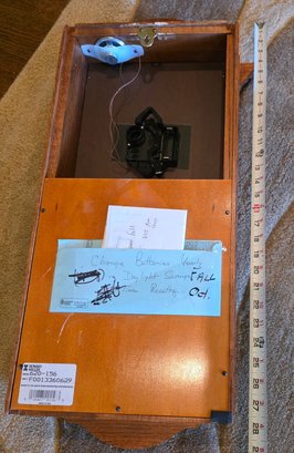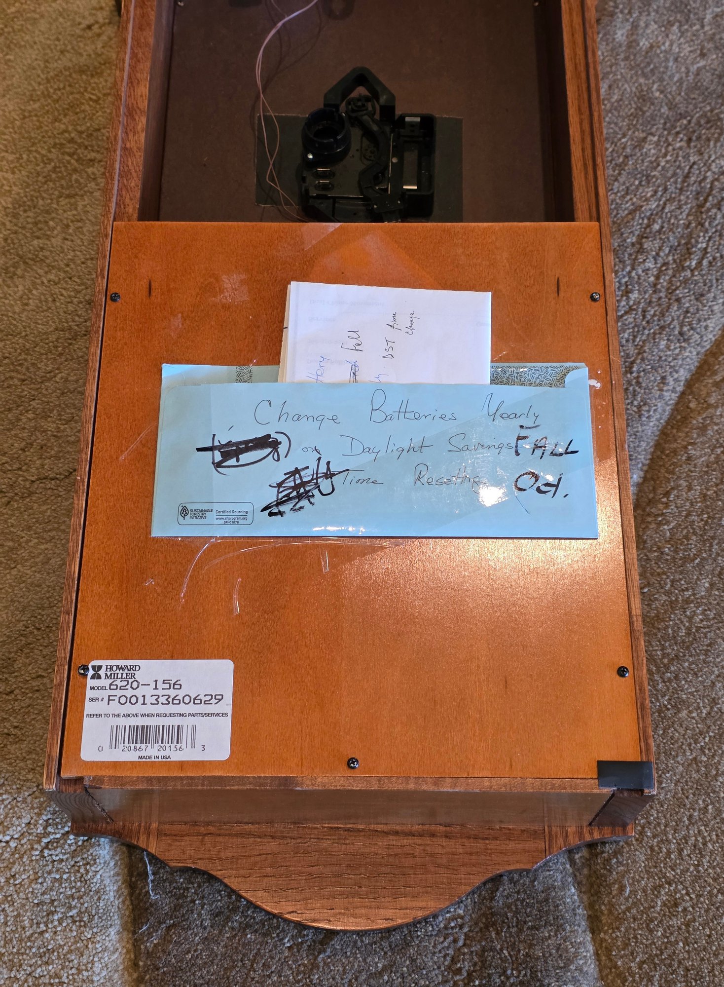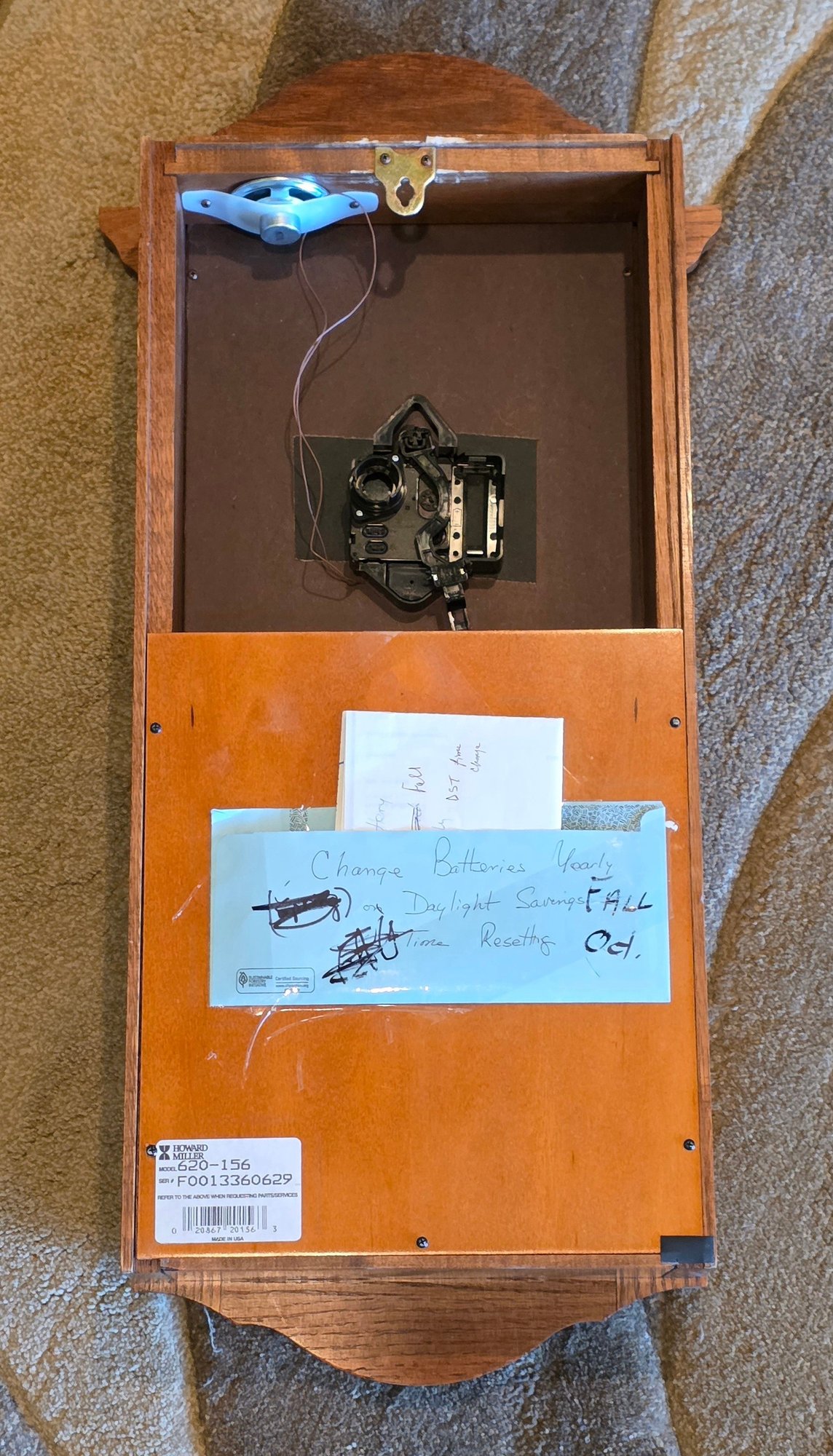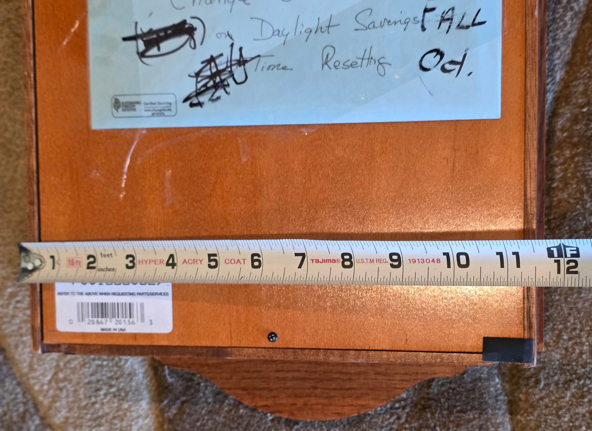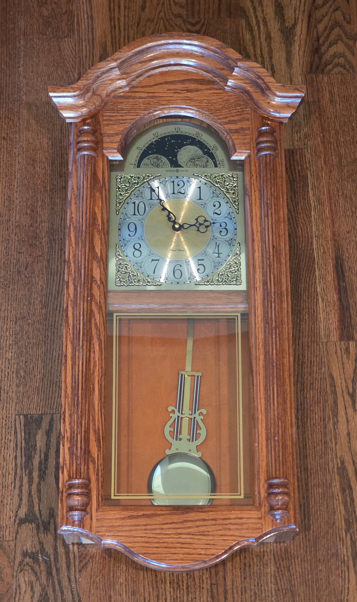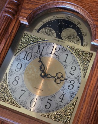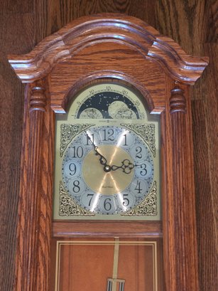 Characterized by its traditional "grandfather clock" styling in a wall-mounted format, featuring a Golden Oak finish