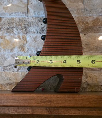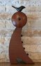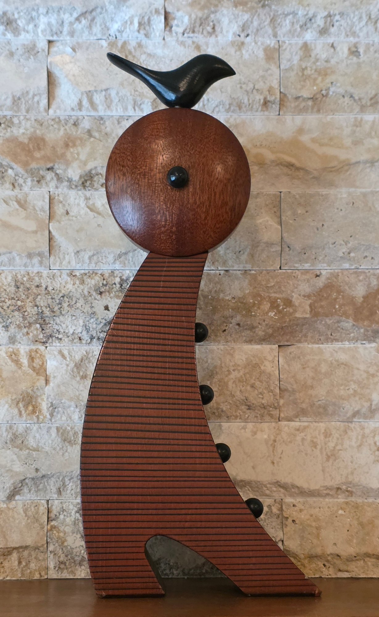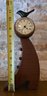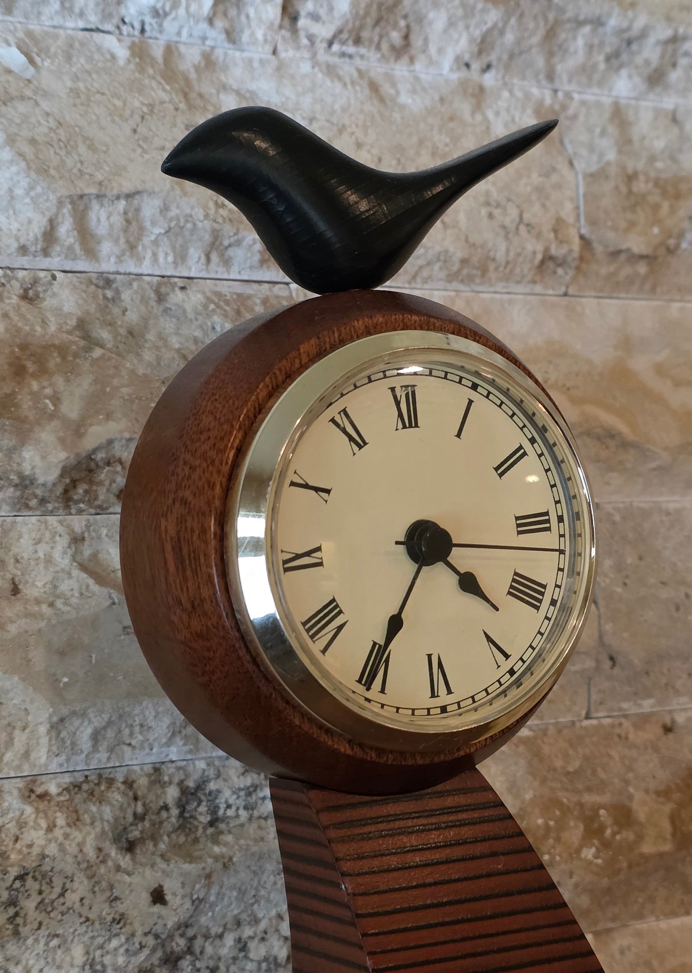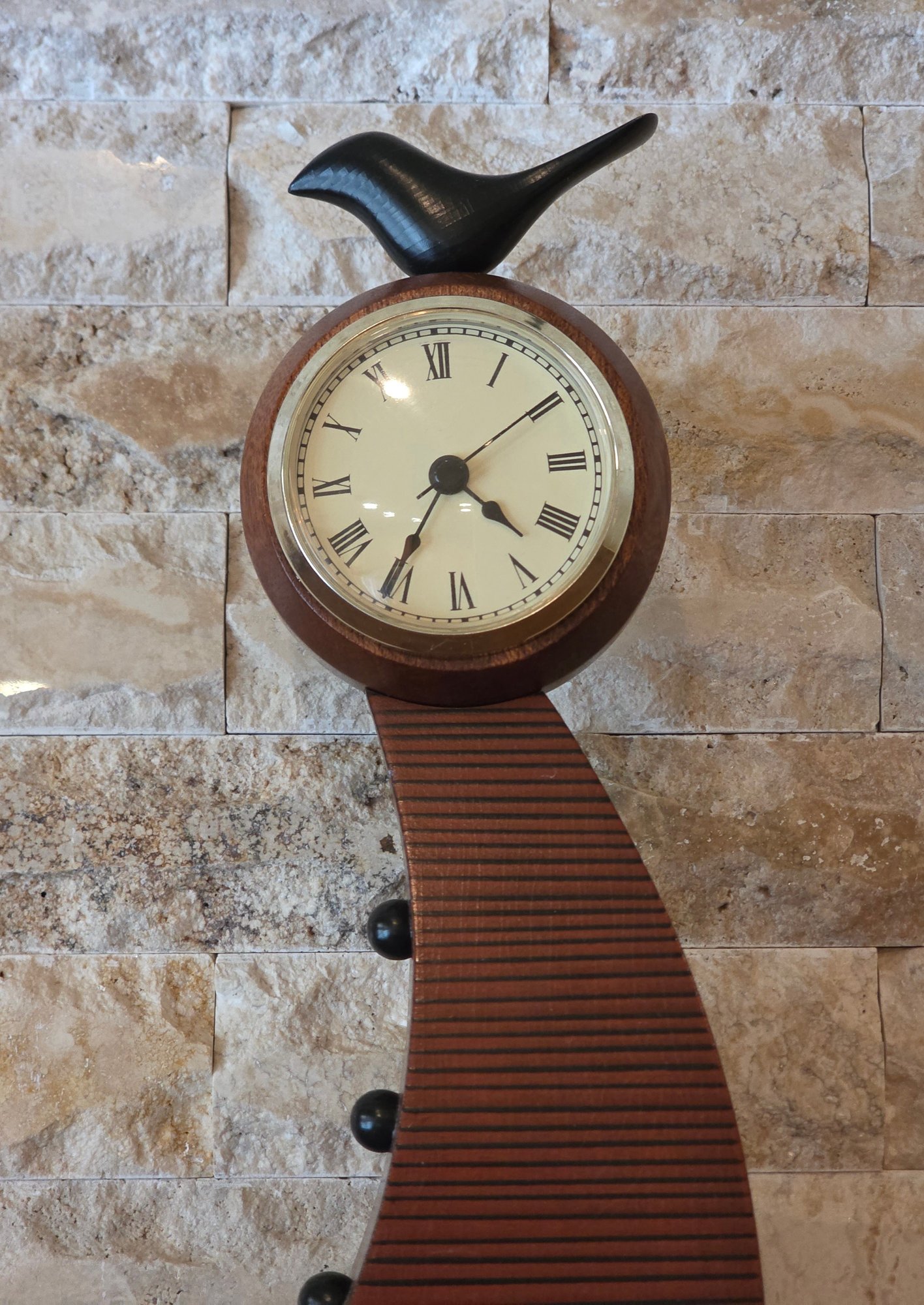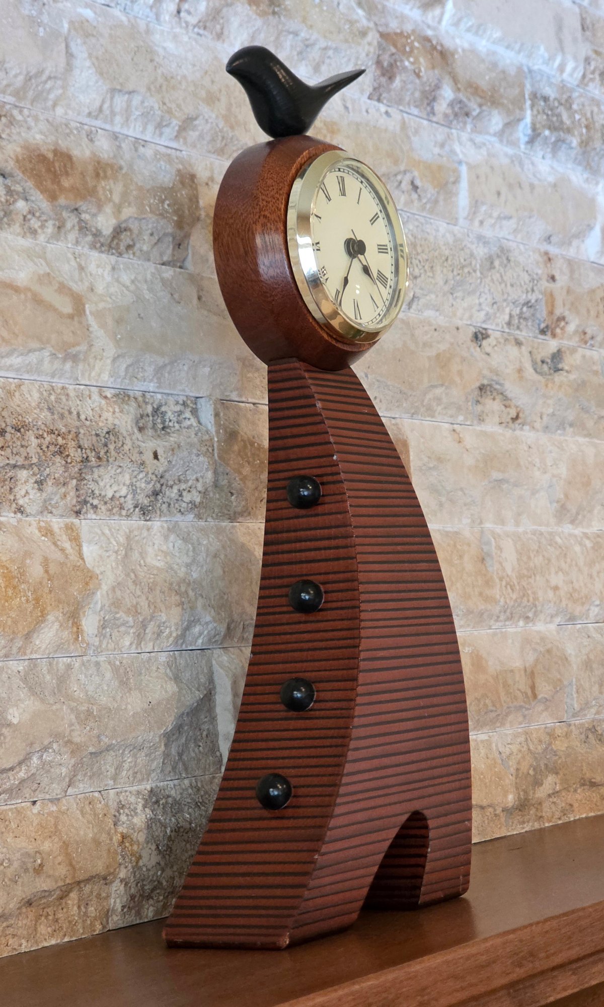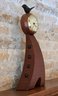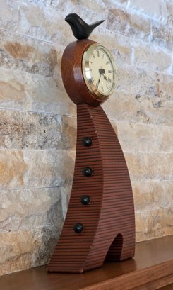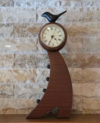 Slender, curved wooden body with a bird figurine on top and a round clock face featuring Roman numerals.