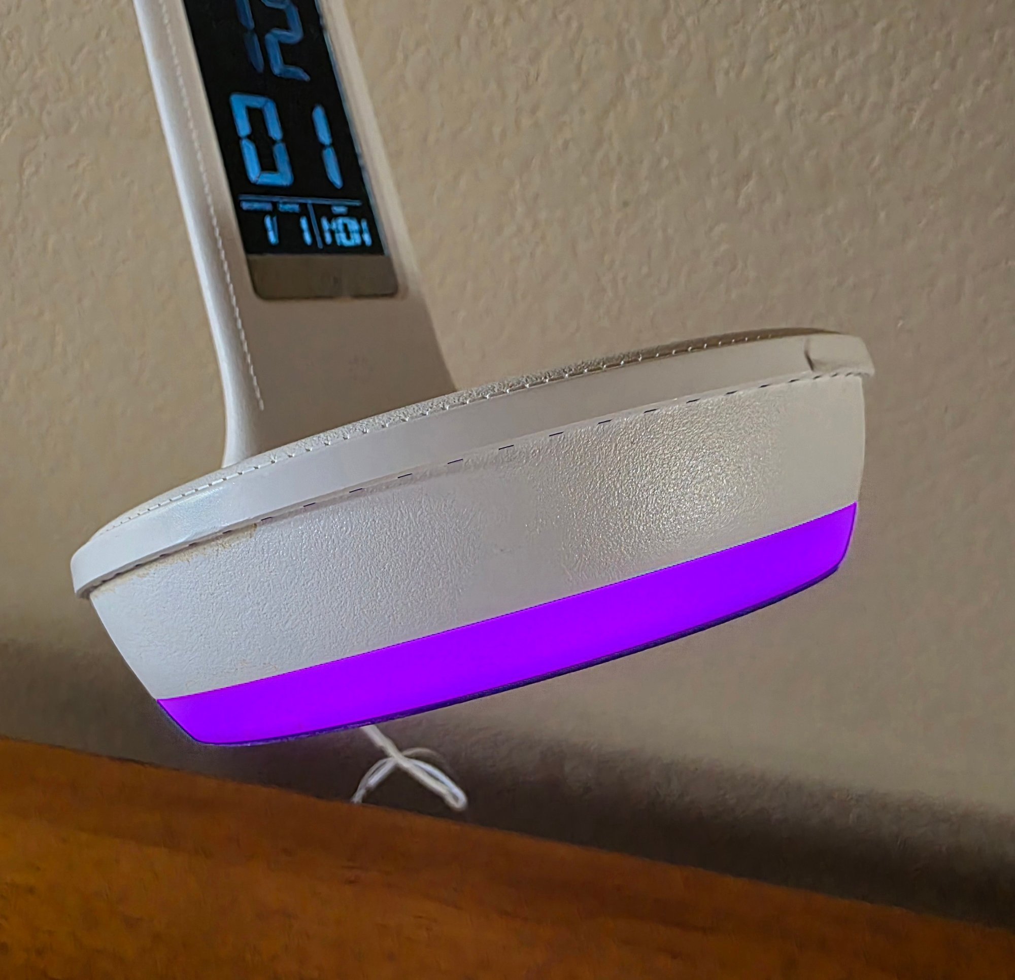 Features a digital display clock, ambient temperature reading, and a wireless charging base.
