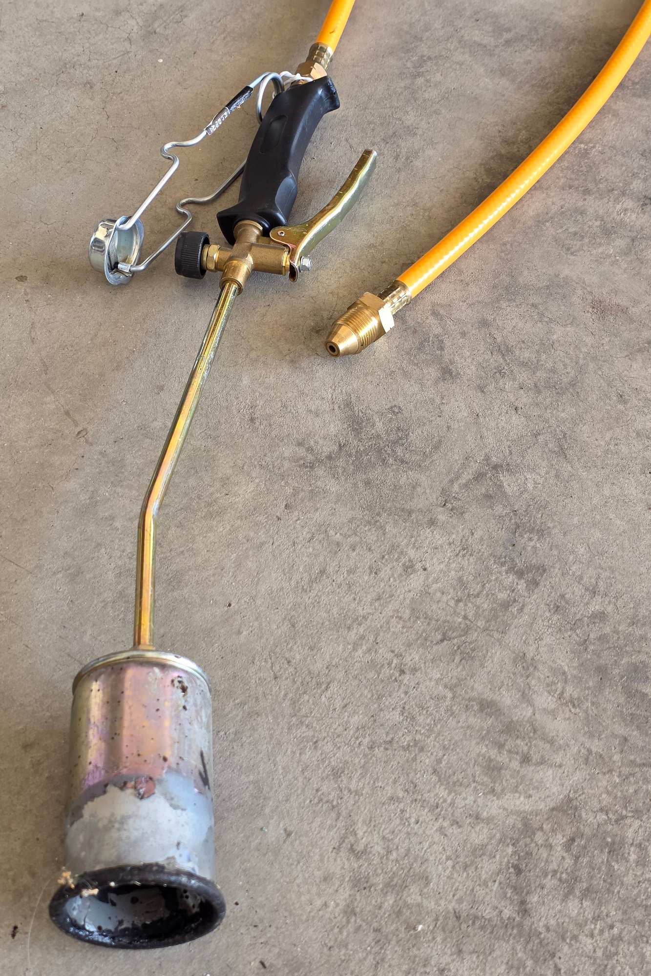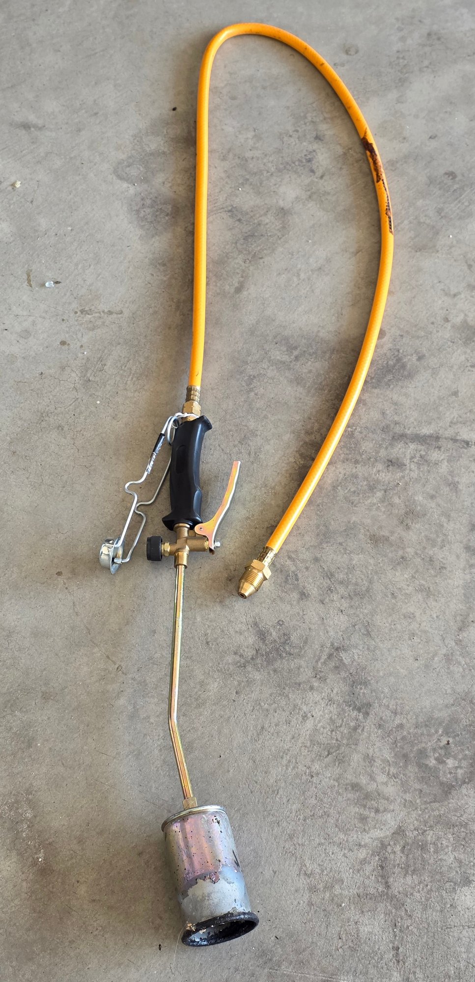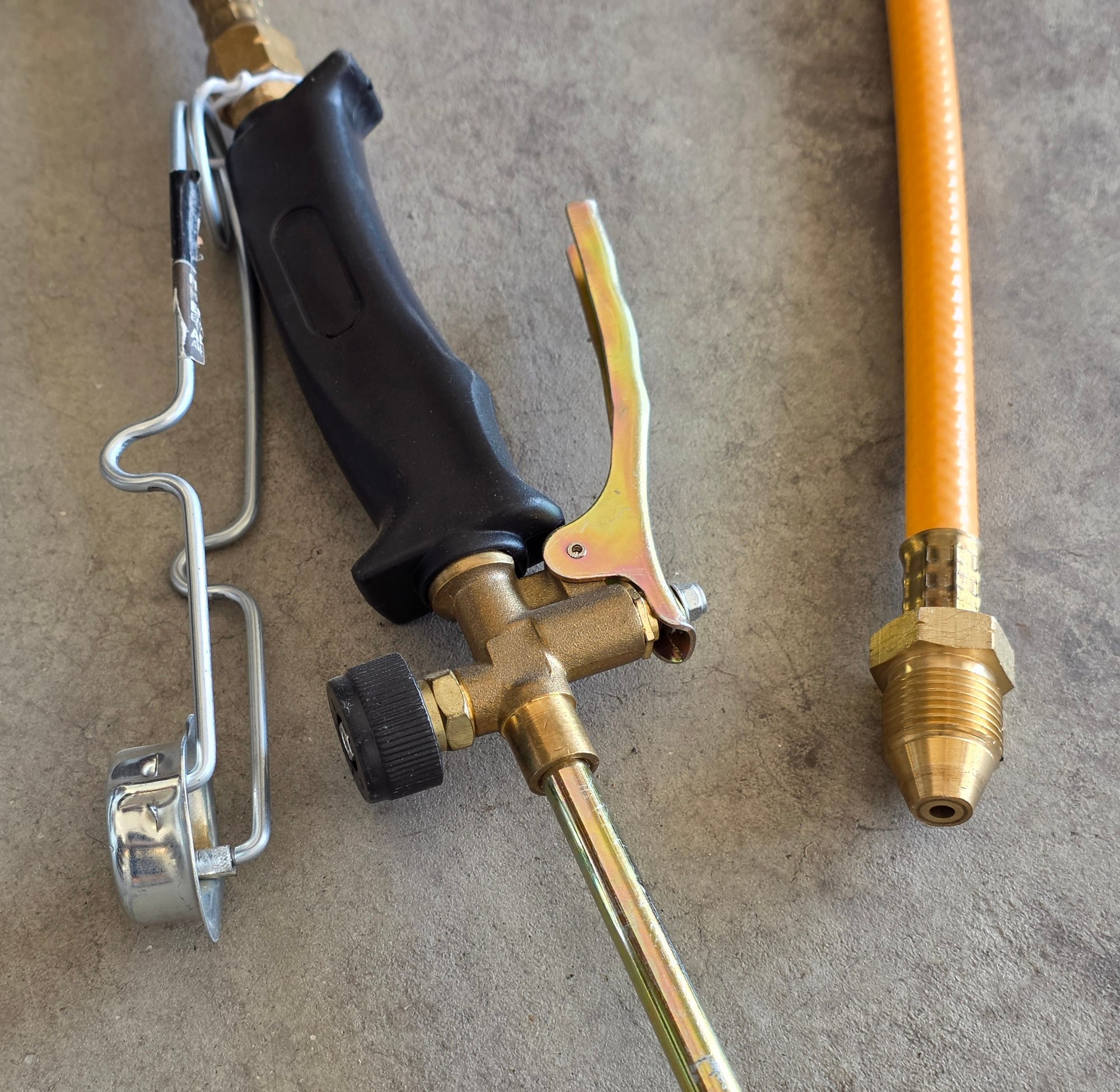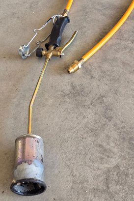 Components: Includes a nozzle, burner tip, handle with a trigger, and a hose for connection to a propane tank.