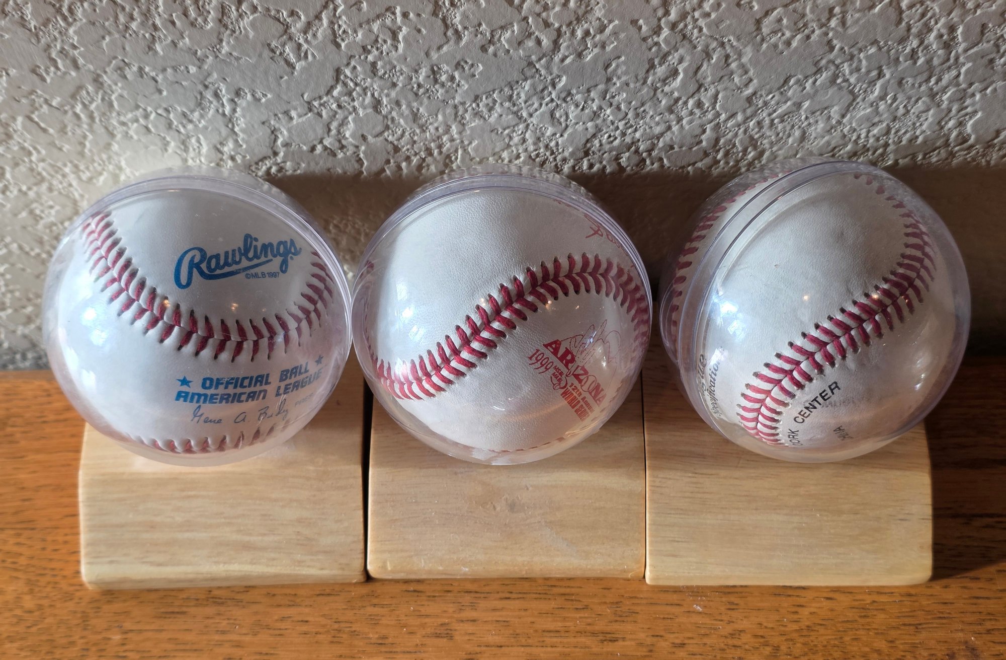 Three Vintage 1990s Rawlings Official American League Baseballs Housed In Protective Plastic Display Case