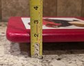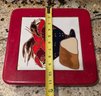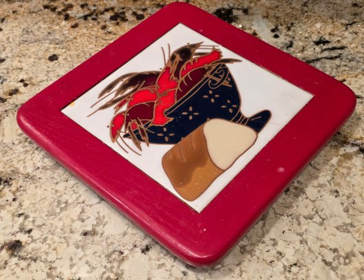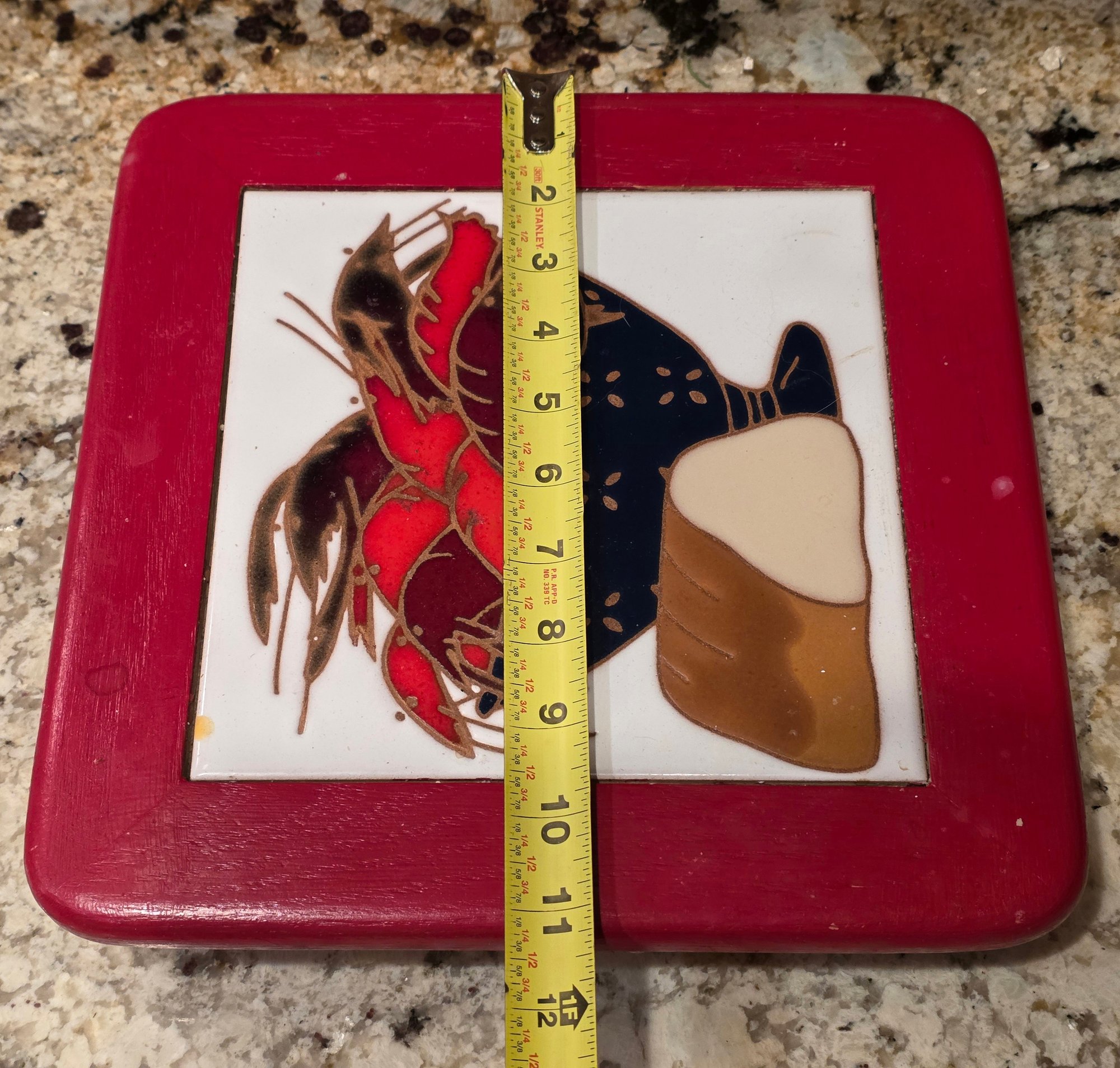 A hand-painted or glazed lobster and bread illustration set inside a red frame.