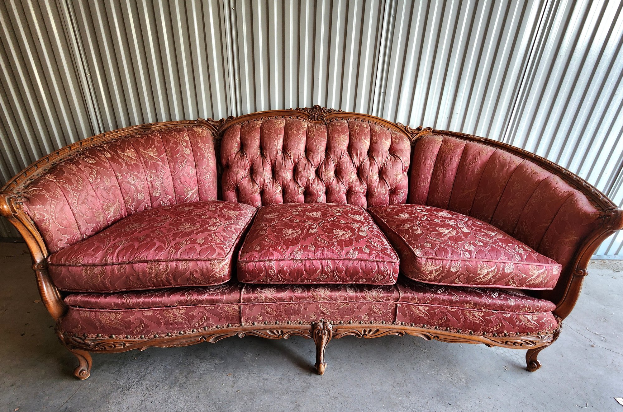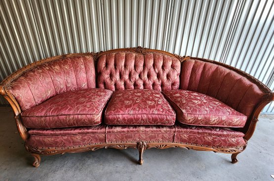 Beautiful Carved Wood outer accents. The cushions are intact and in nice shape considering age and the use this sofa has endured over the years. We do suggest a deep cleaning or a fresh upholstery job since the seating has been in storage for some years.