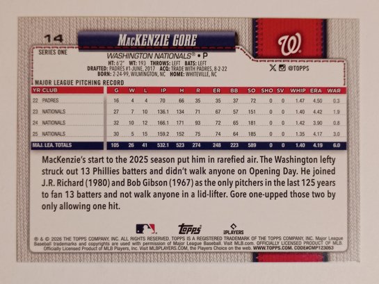 2026 Topps Rainbow MacKenzie Gore Parallel Baseball Card Nationals