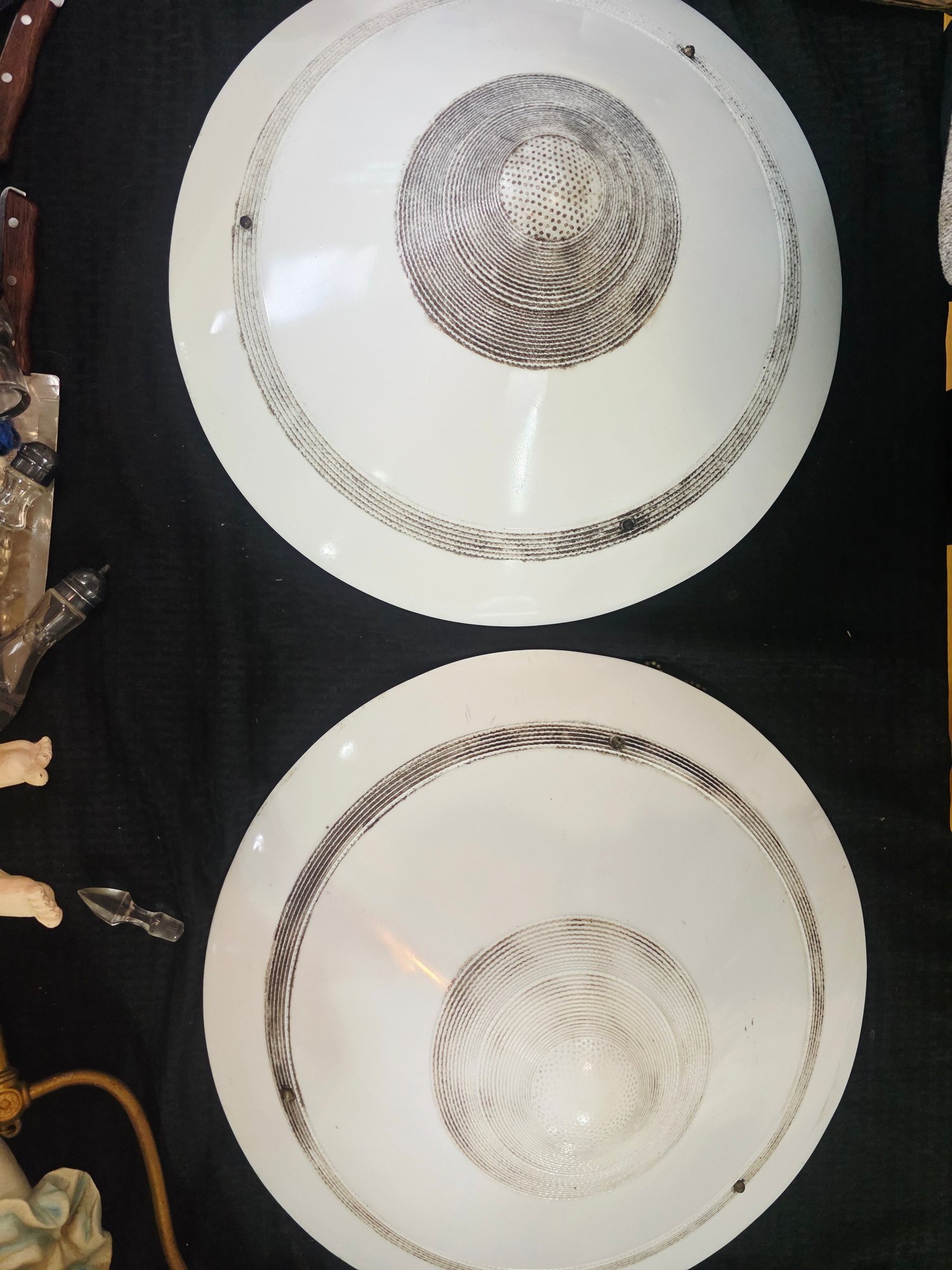 The fixture features a white milk glass shade with a black enameled geometric design accent.