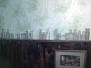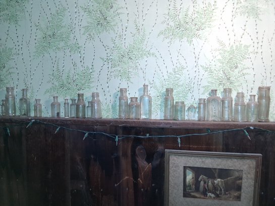All the antique mini clear bottles on wall multiple sizes all in excellent condition as found see pictures for details