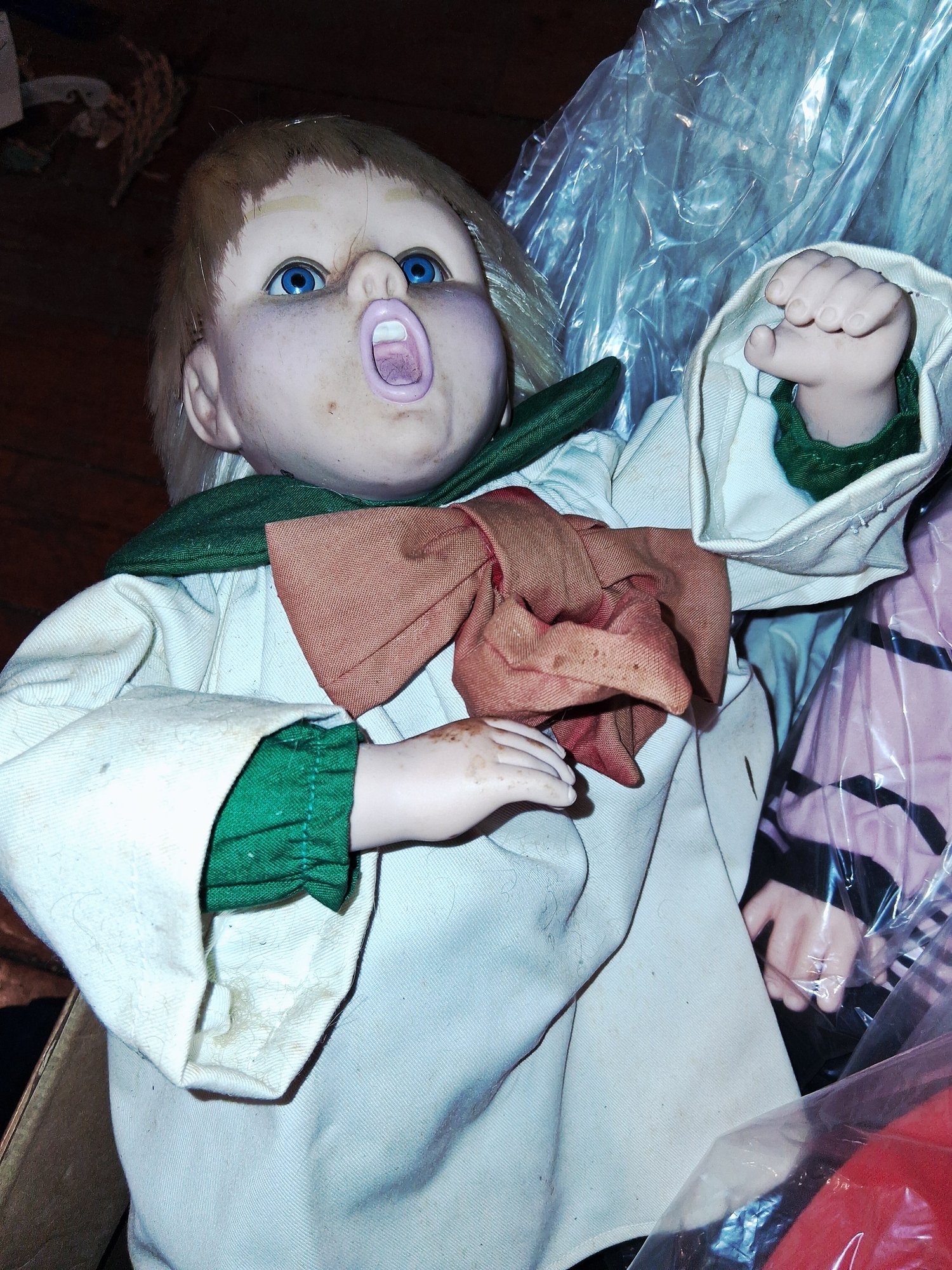 Large bin full of vintage two and a half feet tall dolls new and used as seen in pictures as found see all pictures for details