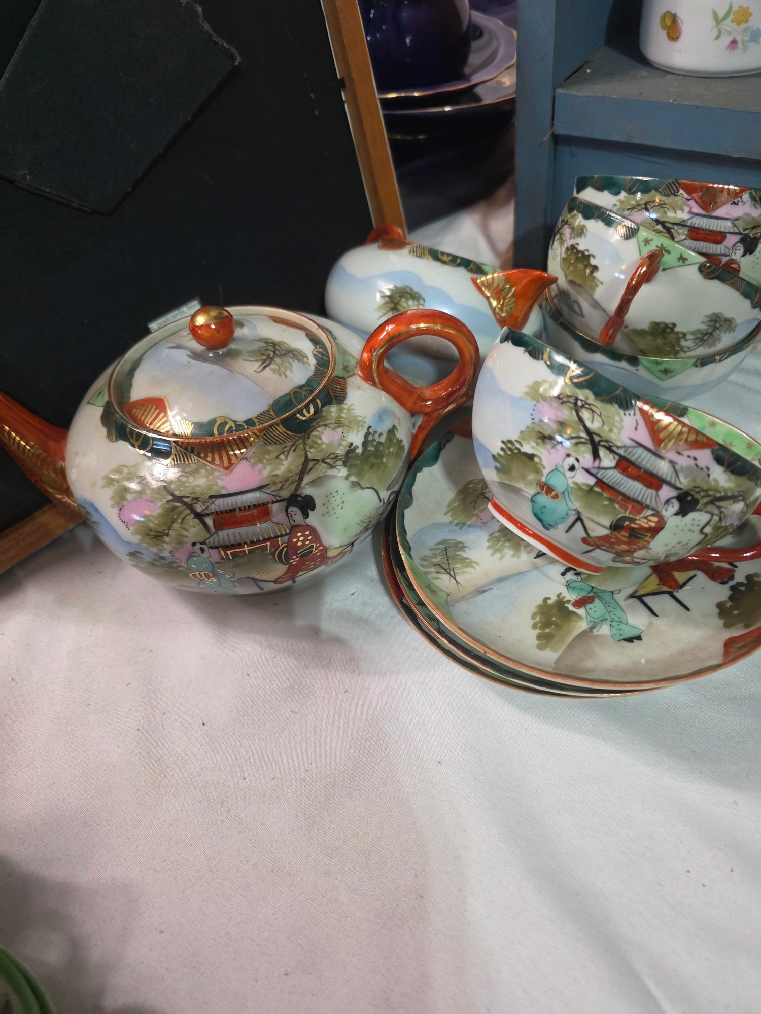 4 cups, 4 saucers, tea pot, milk bowl. Gorgeously handpainted