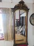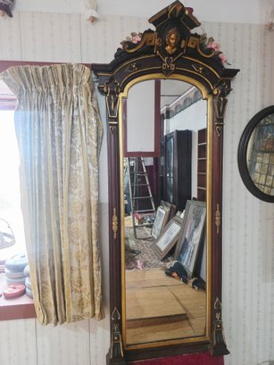 an ornate, full-length mirror, an antique or vintage piece. The mirror's frame has a dark wood finish, accented with gold gilt and carved details.