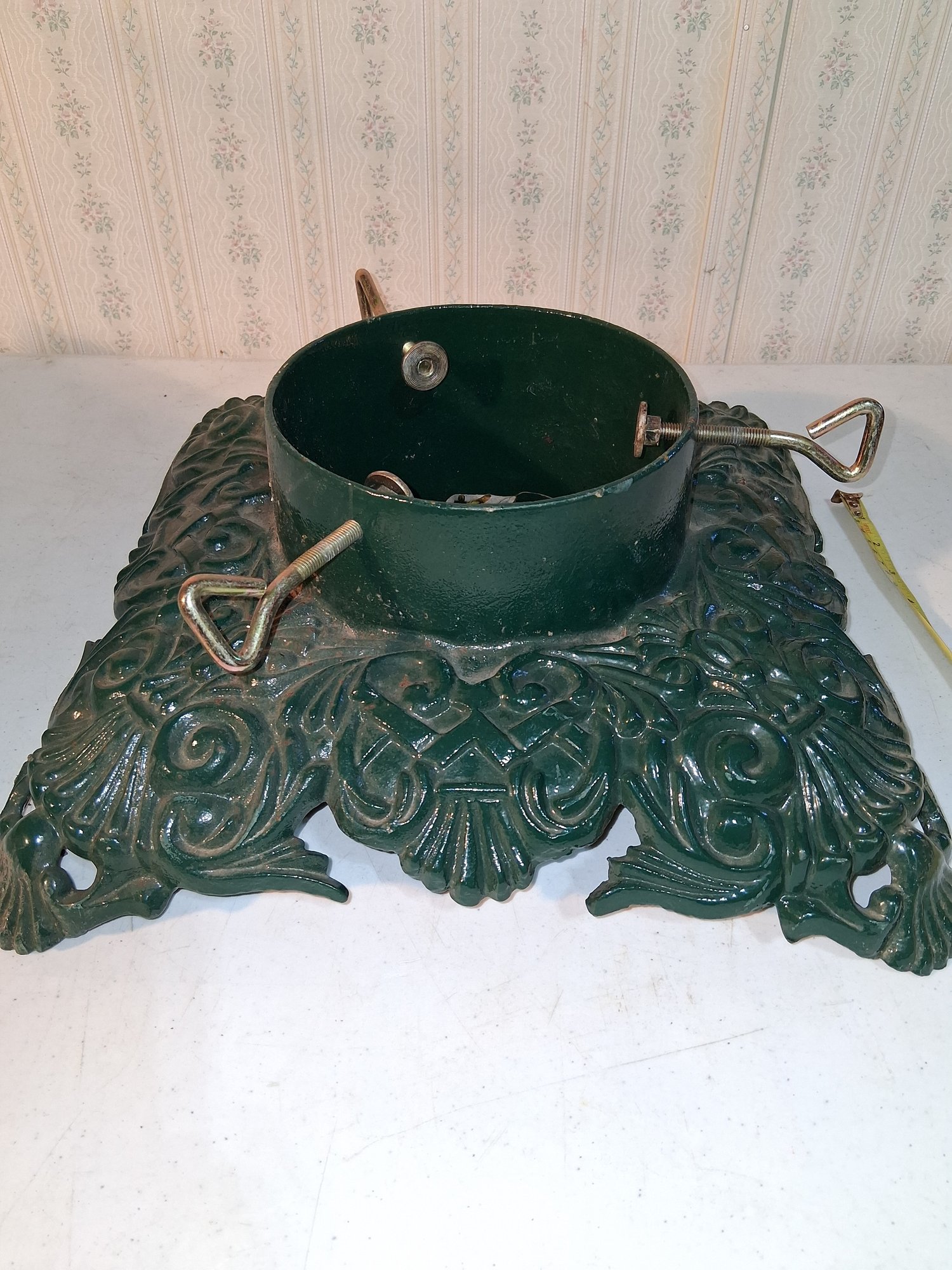 Antique green Iron Christmas tree stand 14 and a half by 14 and 1/2 in wide in excellent condition see pictures for details