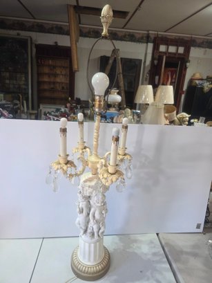 vintage bisque porcelain figural table lamp. The lamp features a base with two cherub figures (also known as putti) holding items and is decorated with a rococo-style design