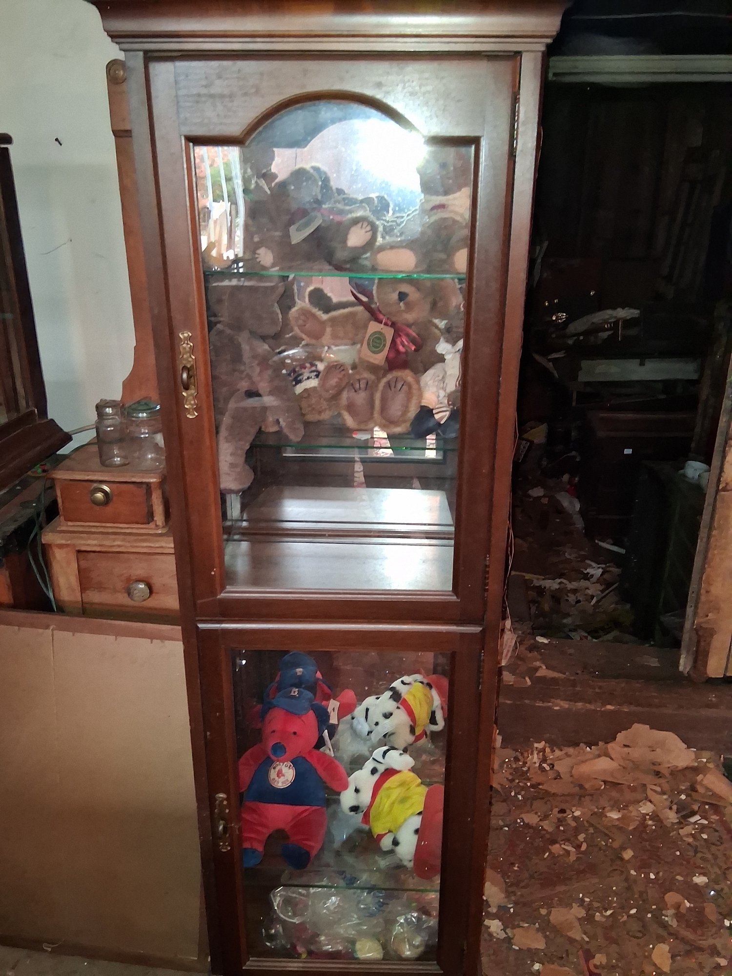 Beautiful antique glass curio with Boyds Bears as found in barn in excellent condition no cracks or chips and glass see pictures for details will need someone to help you move