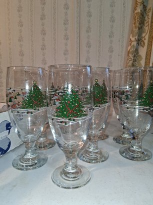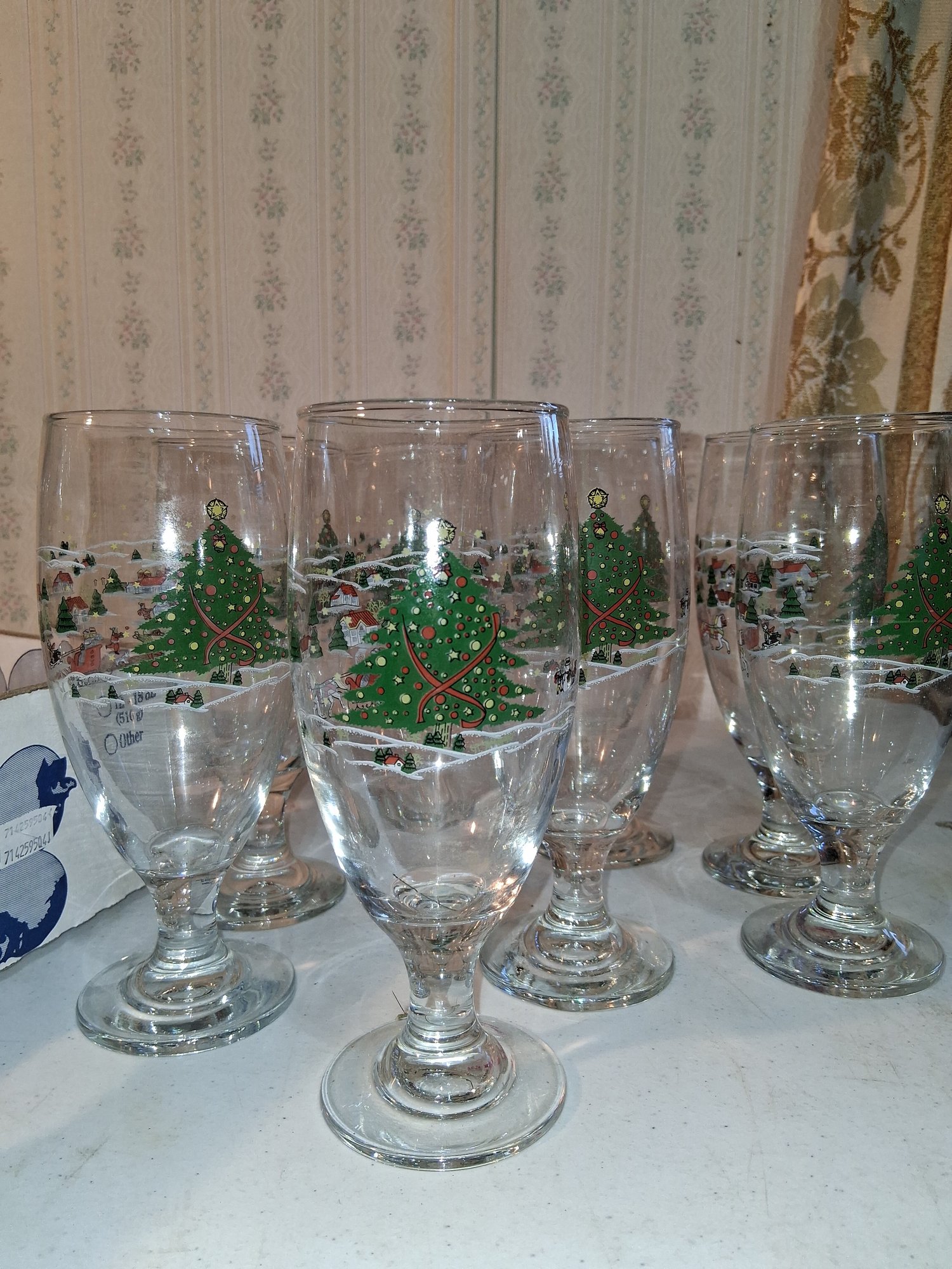Nice set of eight vintage Christmas themed water glasses hand-painted and perfect condition no cracks or chips see pictures for details 8 in tall