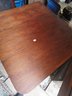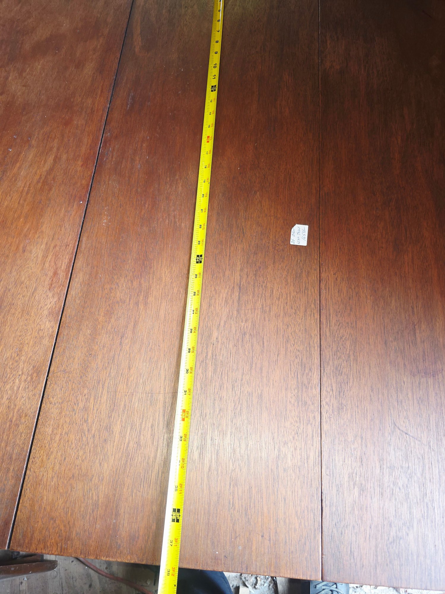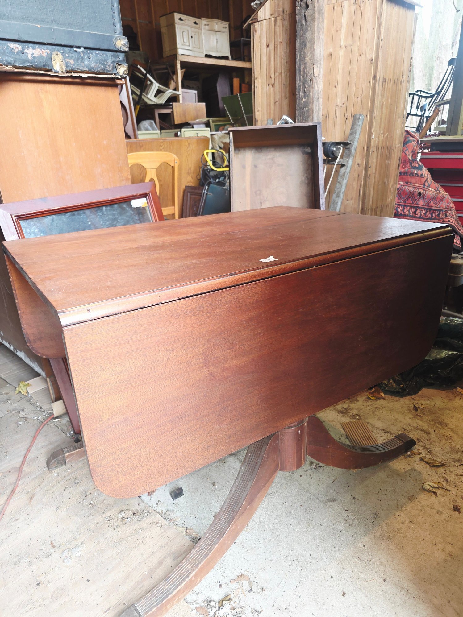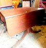 mid-20th century Brandt or similar manufacturer's mahogany Duncan Phyfe-style drop-leaf pedestal dining table. Scratches.
