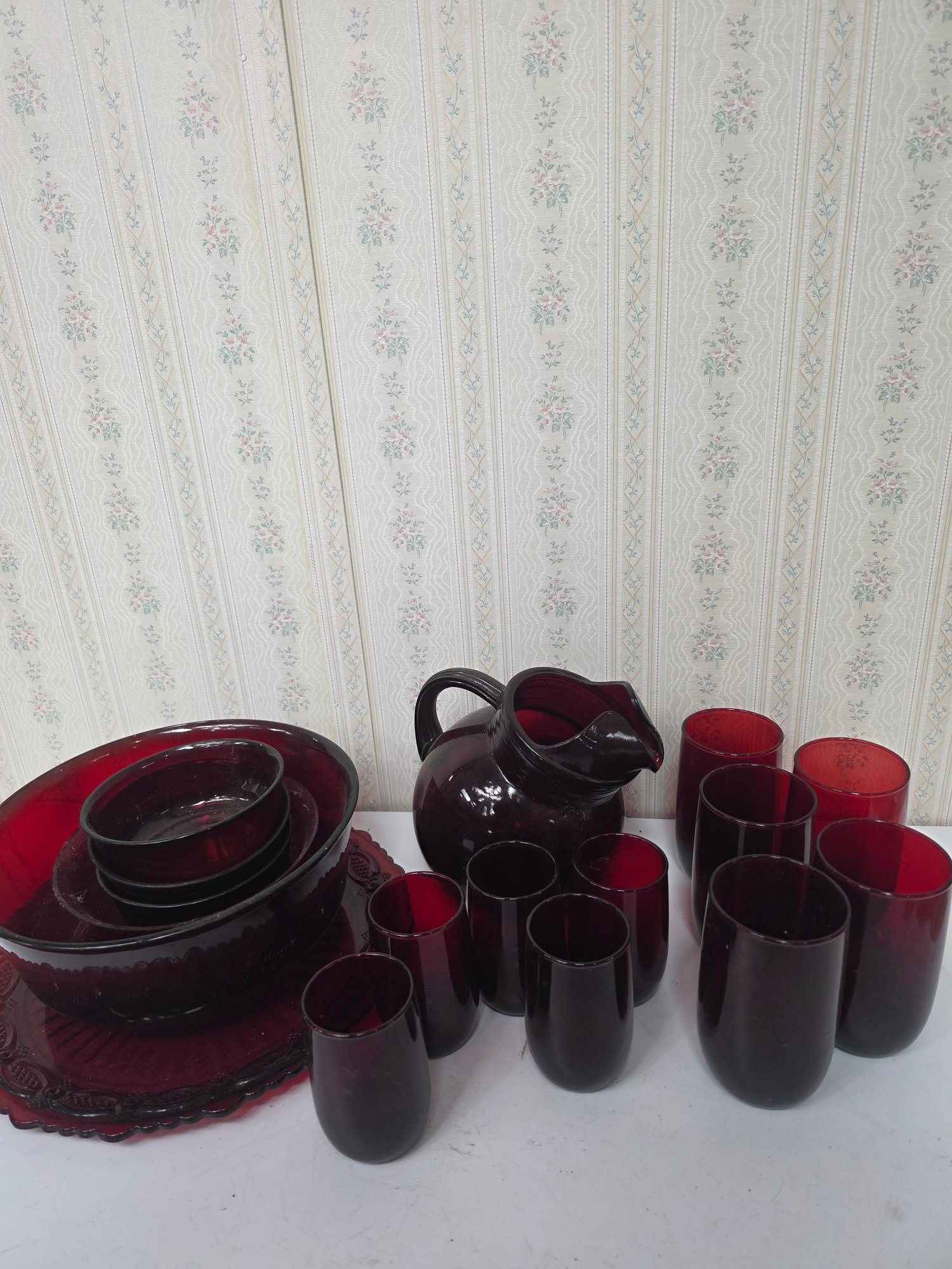 Gorgeous ruby red glass pitcher with matching cups, dishes, platters