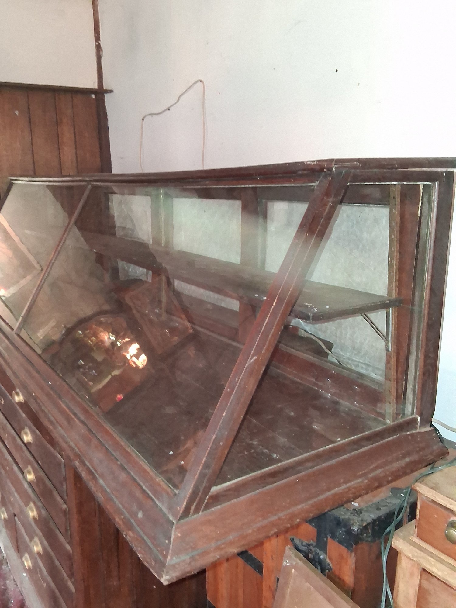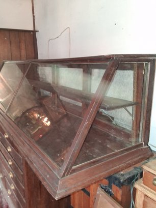 Antique one of a kind 95-inch long glass display case this piece is stunning and complete no broken glass as found in barn see all pictures for details will need another person to help you move. File cabinet under the display is not part of this sale.