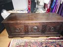 antique carved oak chest or coffer, Tudor, Jacobean, or Renaissance Revival designs.