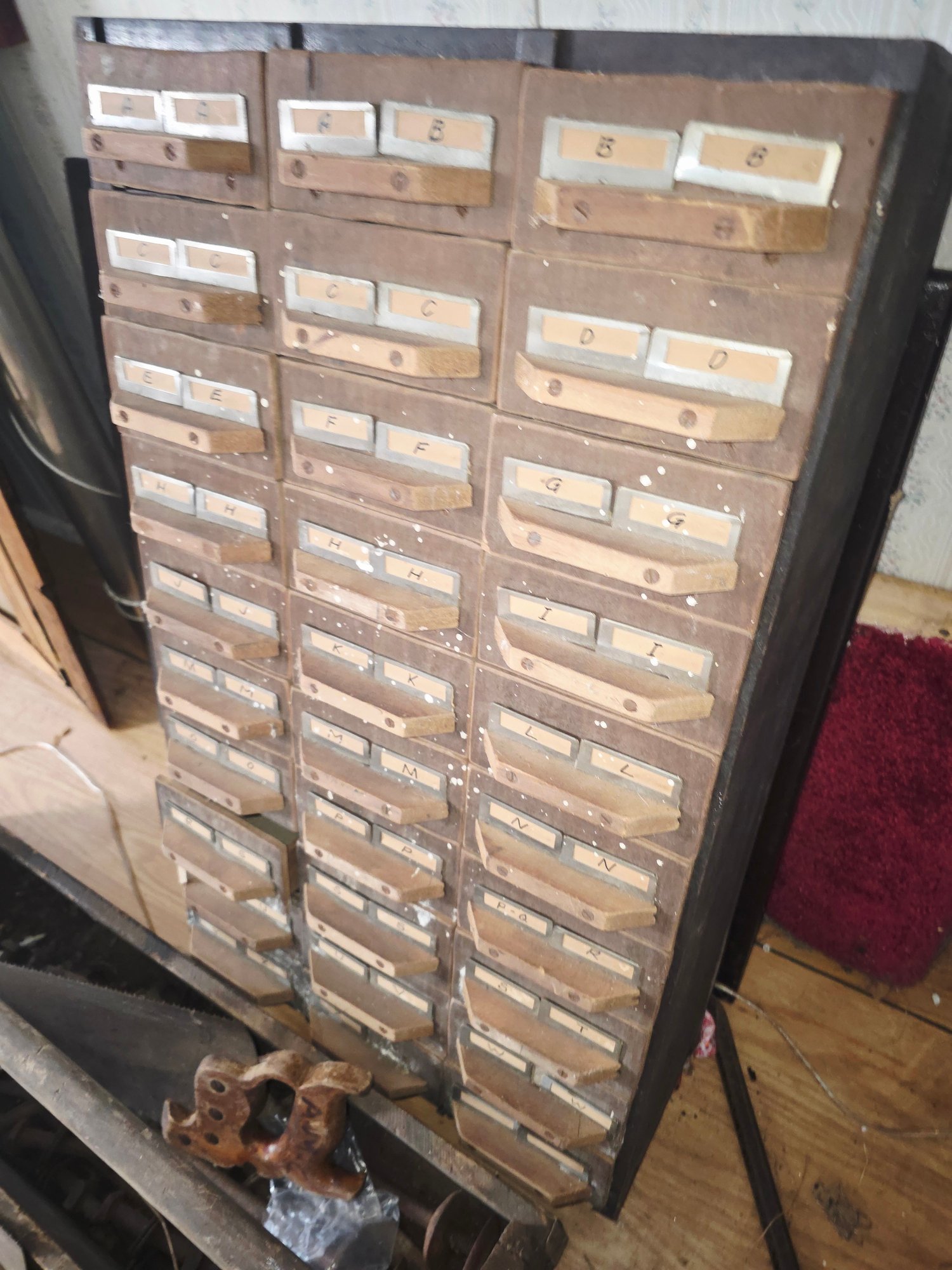 industrial multi-drawer parts or card catalog cabinet. All drawers there, wood needs new coat of paint