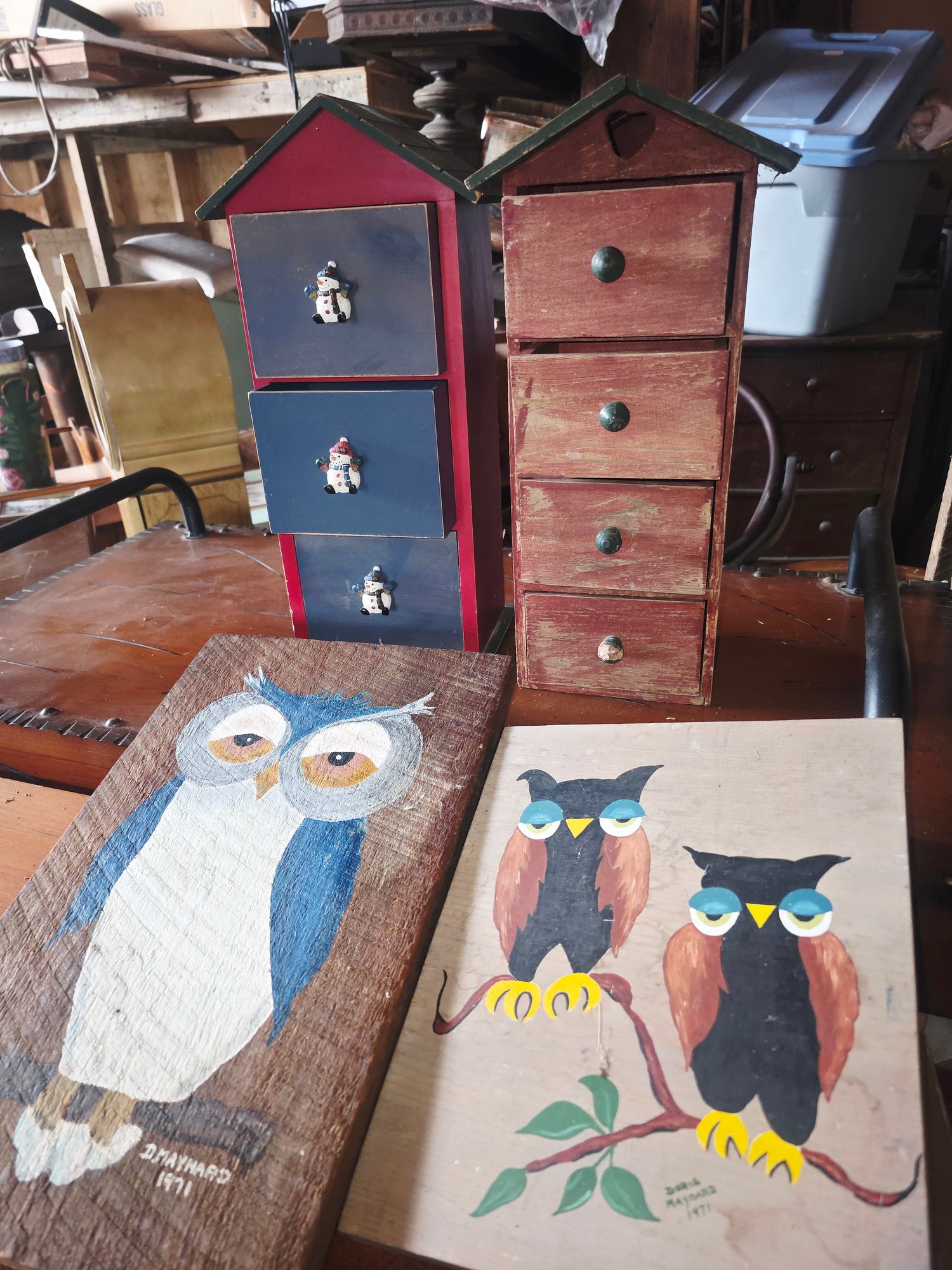Folk art paintings and painted small cabinets