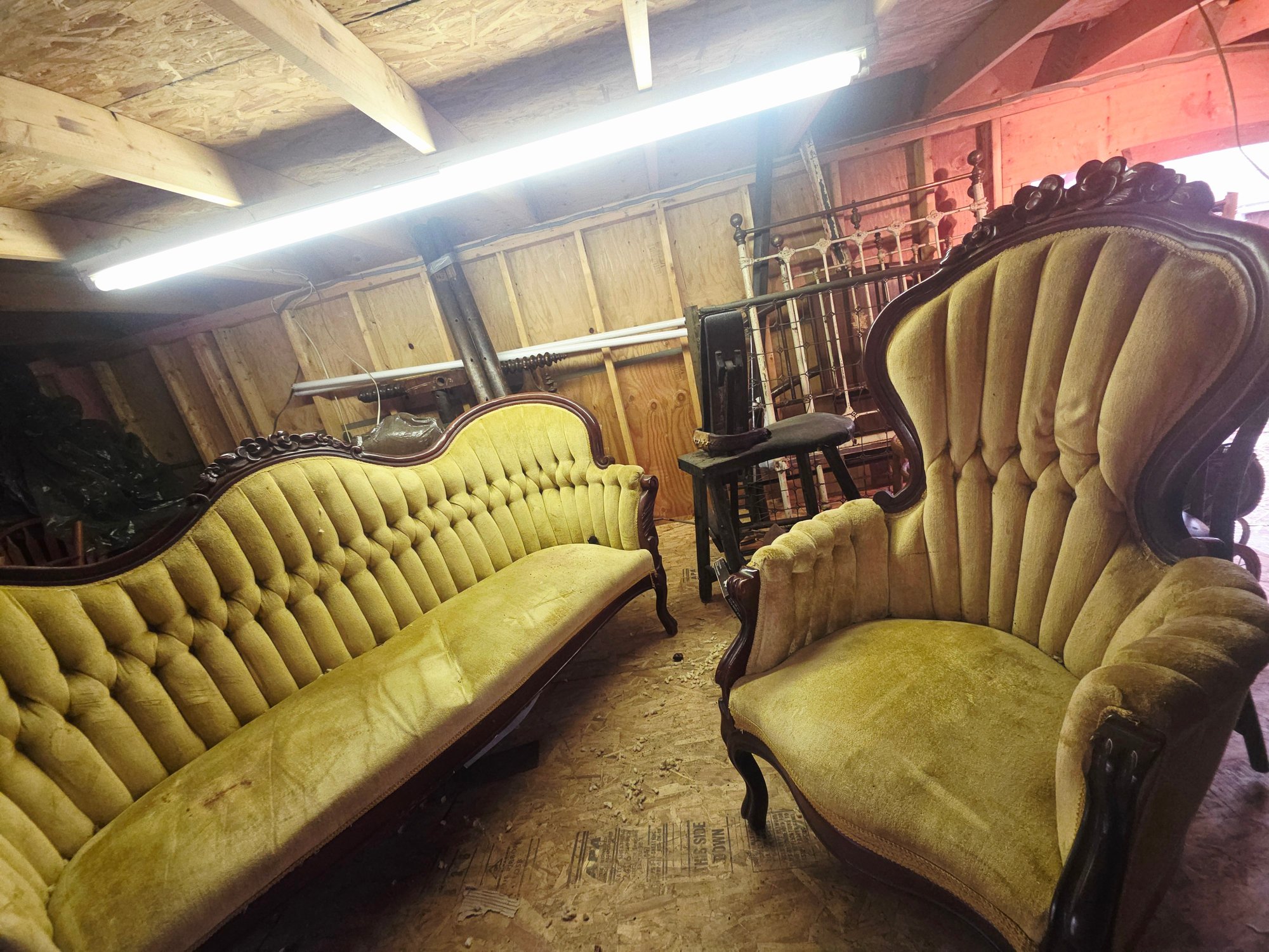 Victorian-style chaise lounge or settee with gold green velvet upholstery and carved wood trim, with matching Kimball Victorian reproduction wing chair