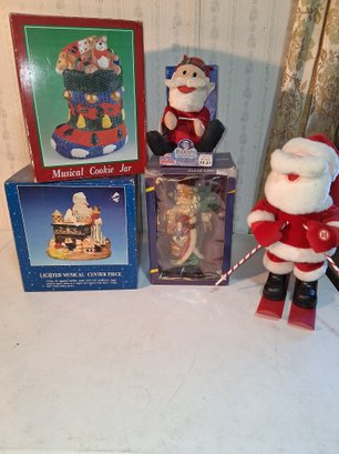 Vintage Christmas musical cookie jar light at musical centerpiece Glass Santa Rudolph the Red-Nosed Reindeer Santa and Santa on skis all appear to be new as found see pictures for details