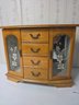 vintage wooden jewelry armoire with glass doors featuring a floral design.