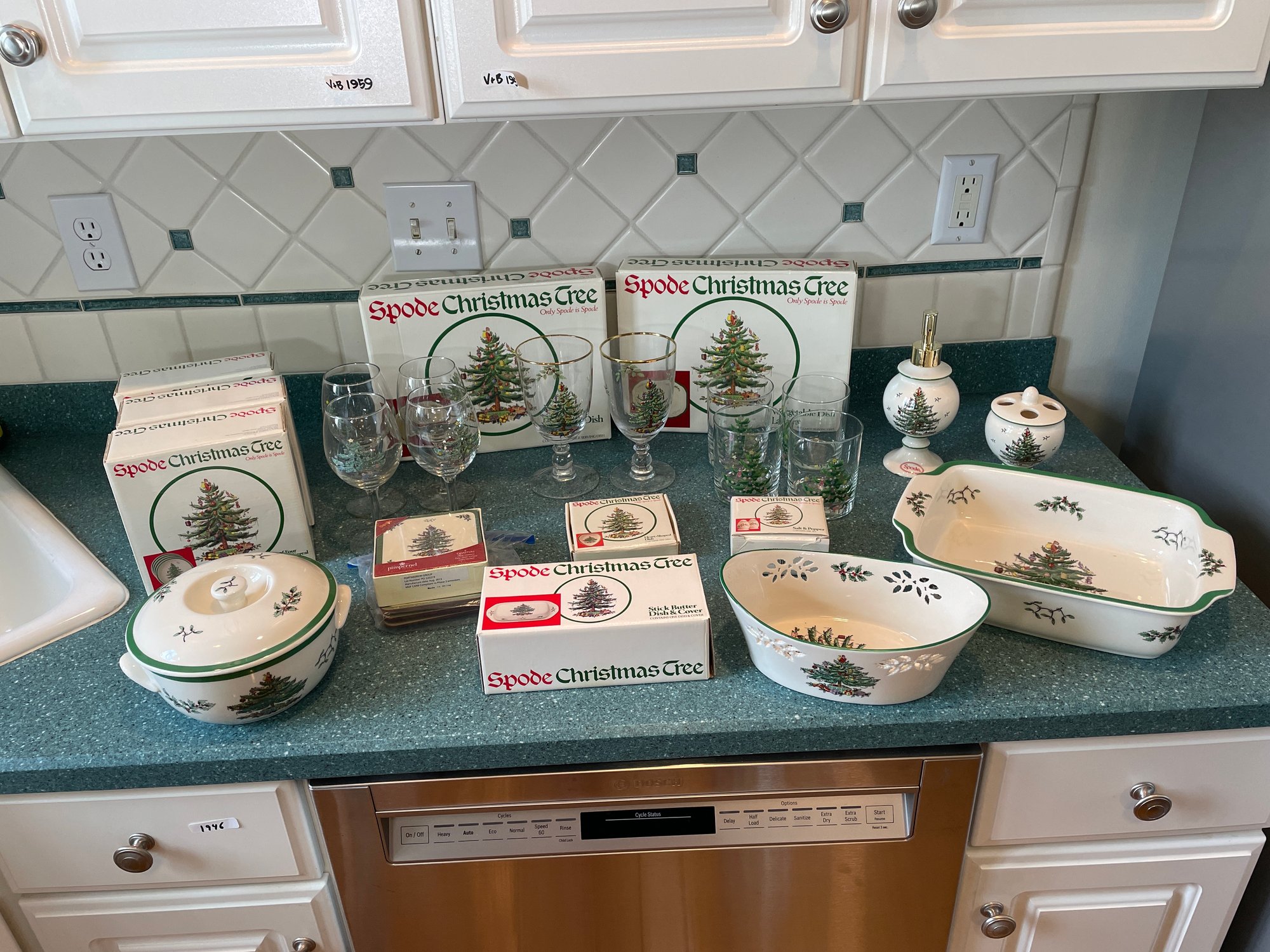 Two large vegetable dishes, three sets of four cereal bowls, four wine glasses, two sets of coasters, heart-shaped dish, salt and pepper shakers, stick butter dish and dish cover, 4 drinking glasses, soap dispenser and toothbrush holder, Pyrex type dish, bread bowl, large pitcher