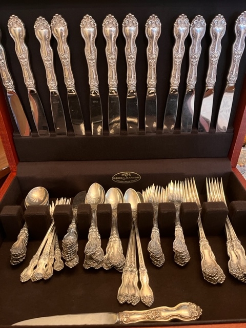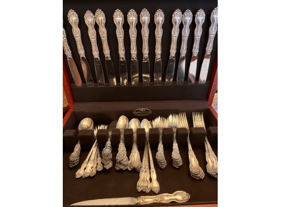 94 Pieces.12 Dinner Knives-7 Soup Spoons-8 Oyster Forks-10 Butter Spreaders-16 Small Spoons-15 Salad Forks-12 Dinner Forks-8 Serving Pieces-6 Teaspoons
