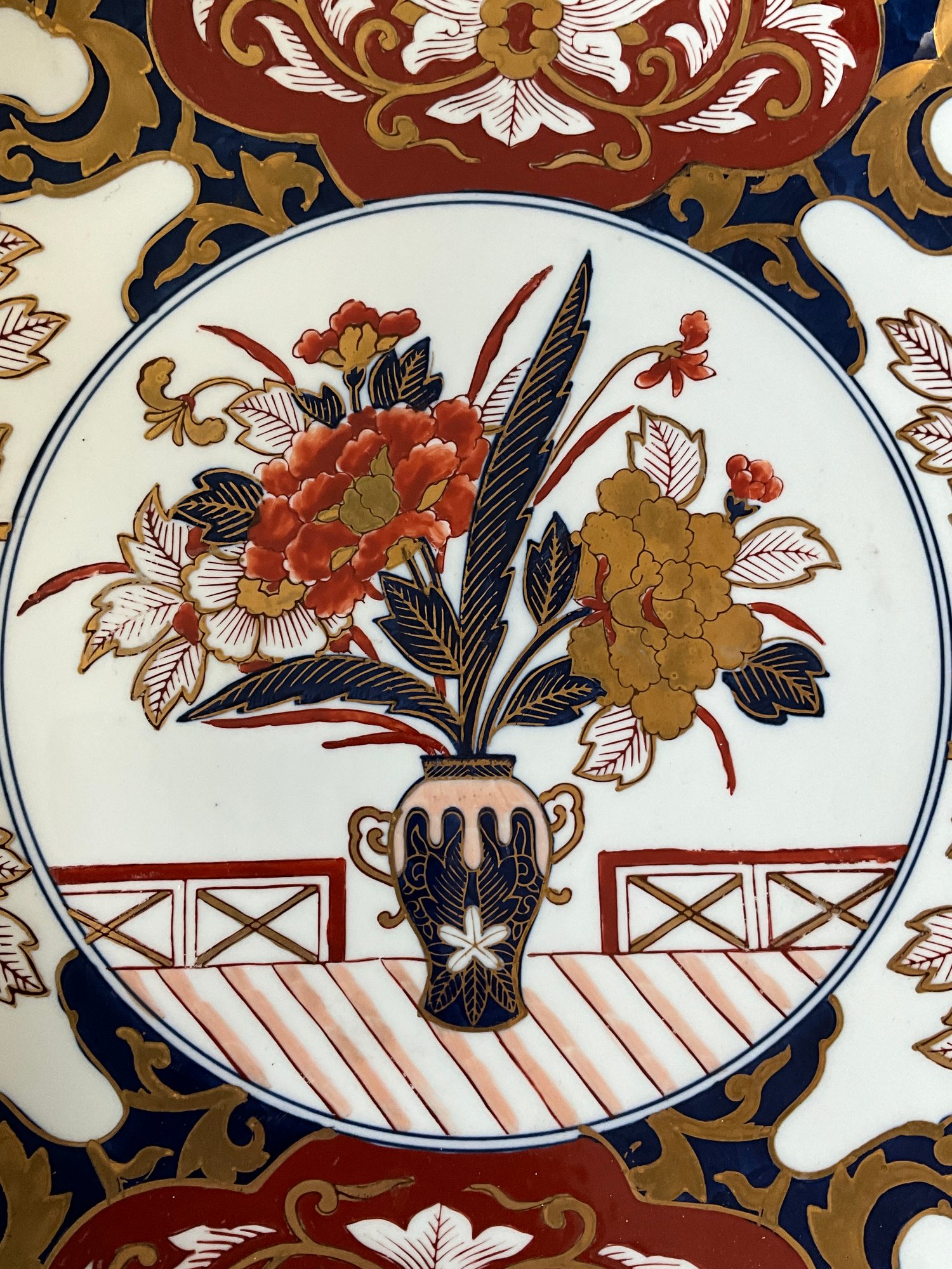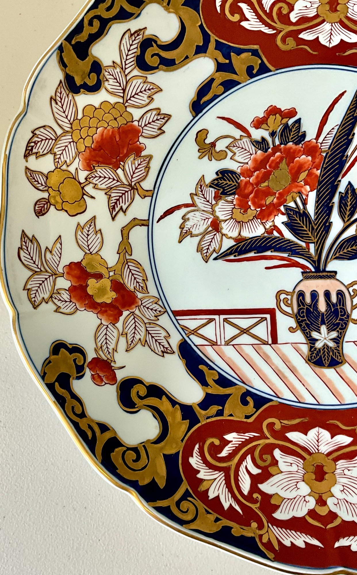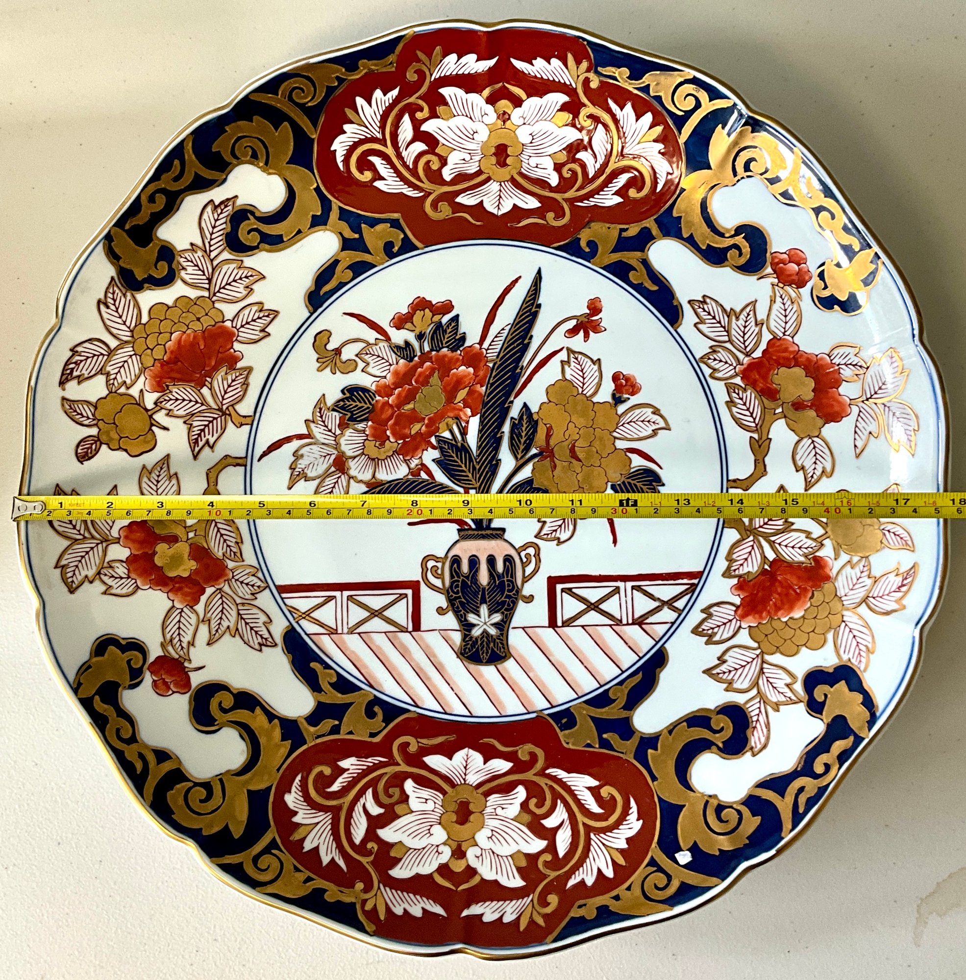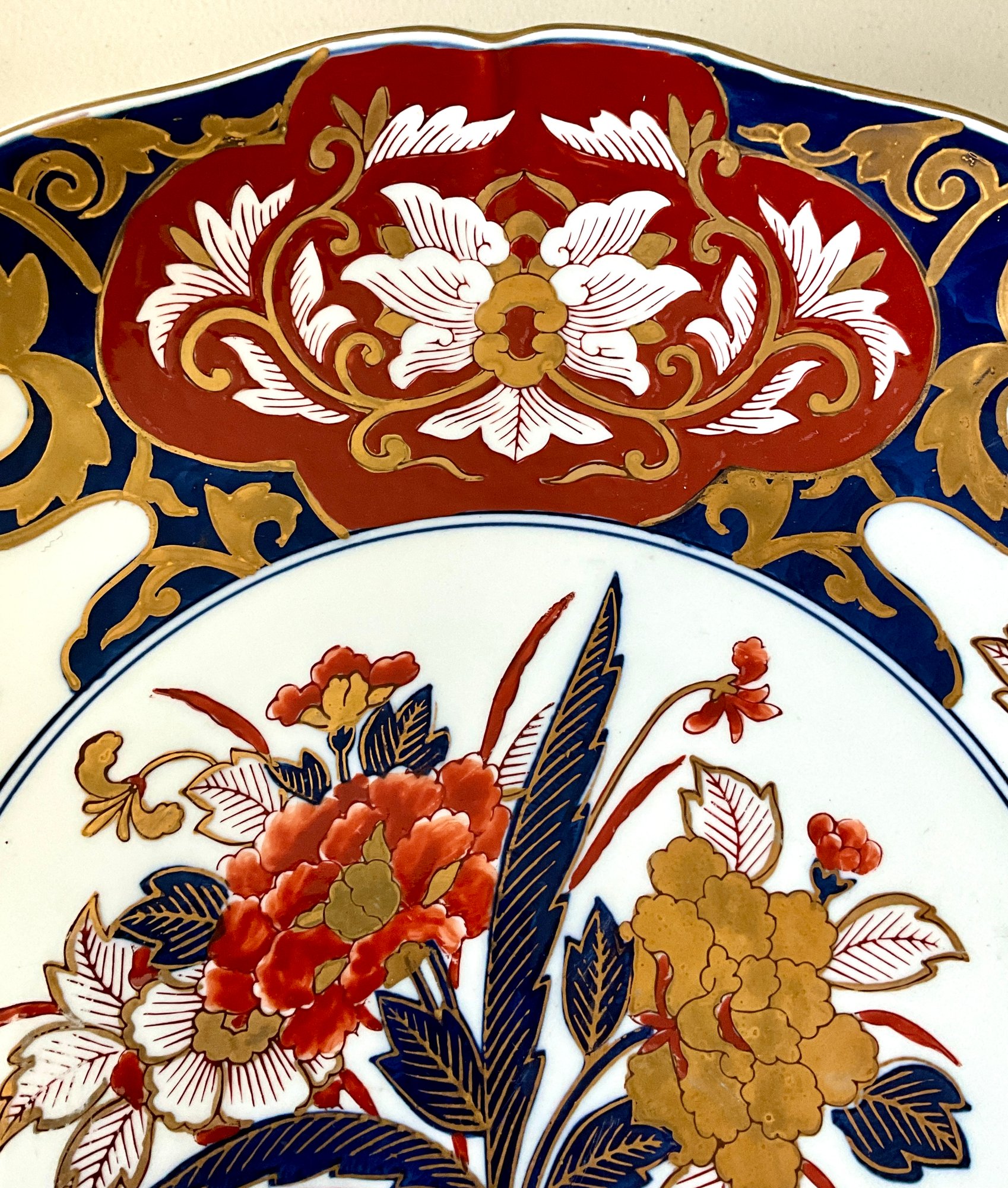 The large antique Japanese Imari plate is a fine example of quality Imari porcelain, featuring a scalloped edge. Its central design showcases a basket of flowers, surrounded by hand-painted flowers and leaves in red, blue, green, and white colors.