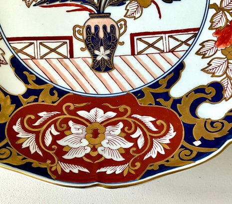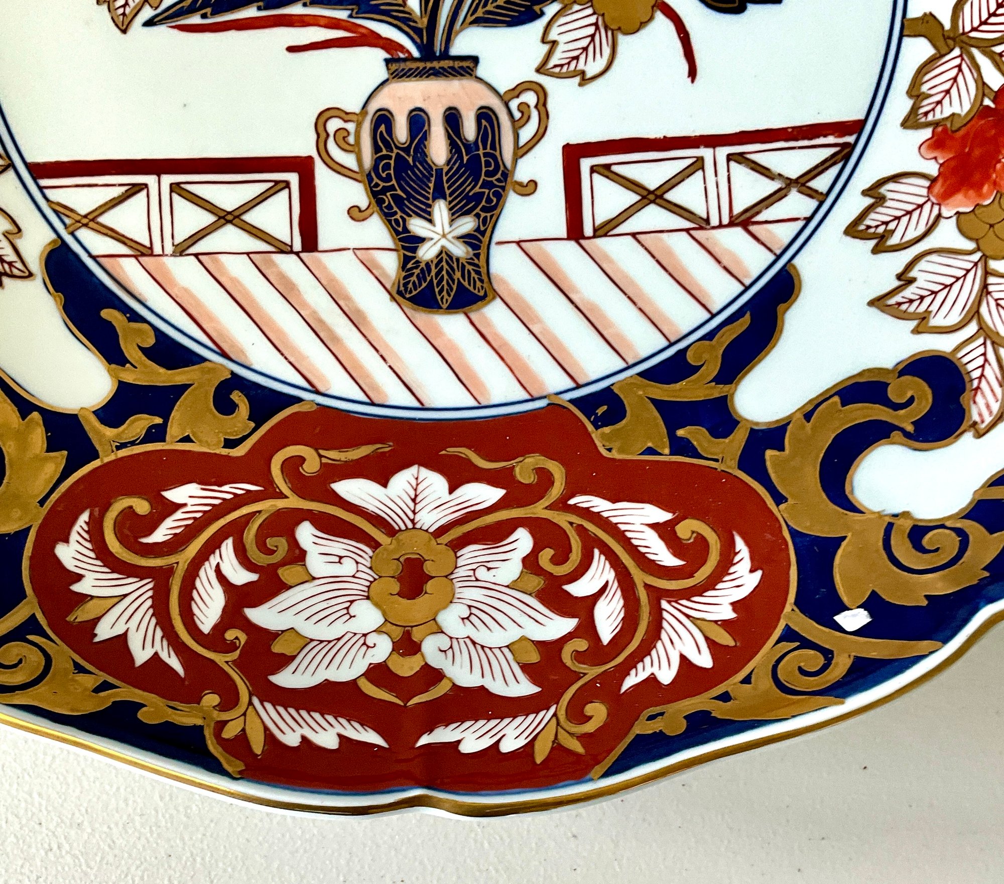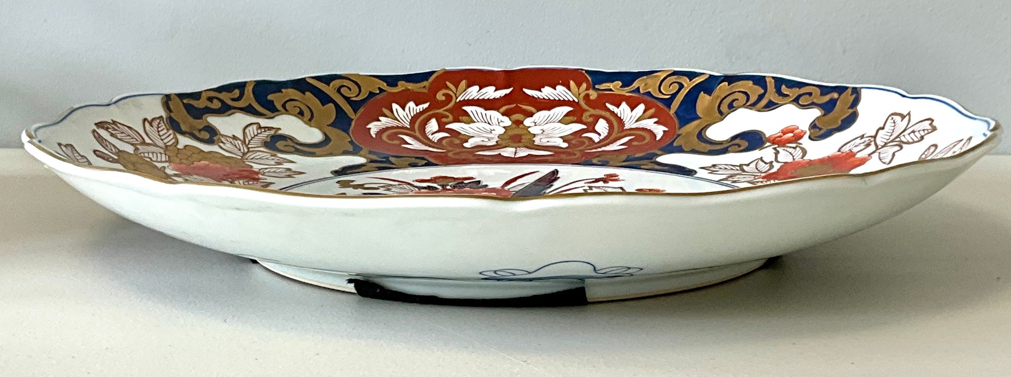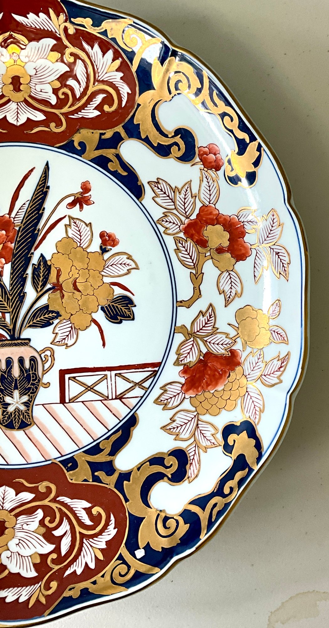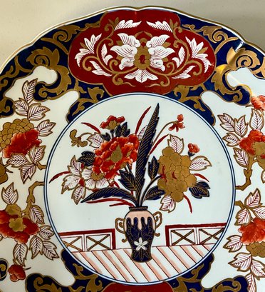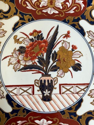 The large antique Japanese Imari plate is a fine example of quality Imari porcelain, featuring a scalloped edge. Its central design showcases a basket of flowers, surrounded by hand-painted flowers and leaves in red, blue, green, and white colors.