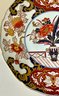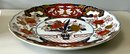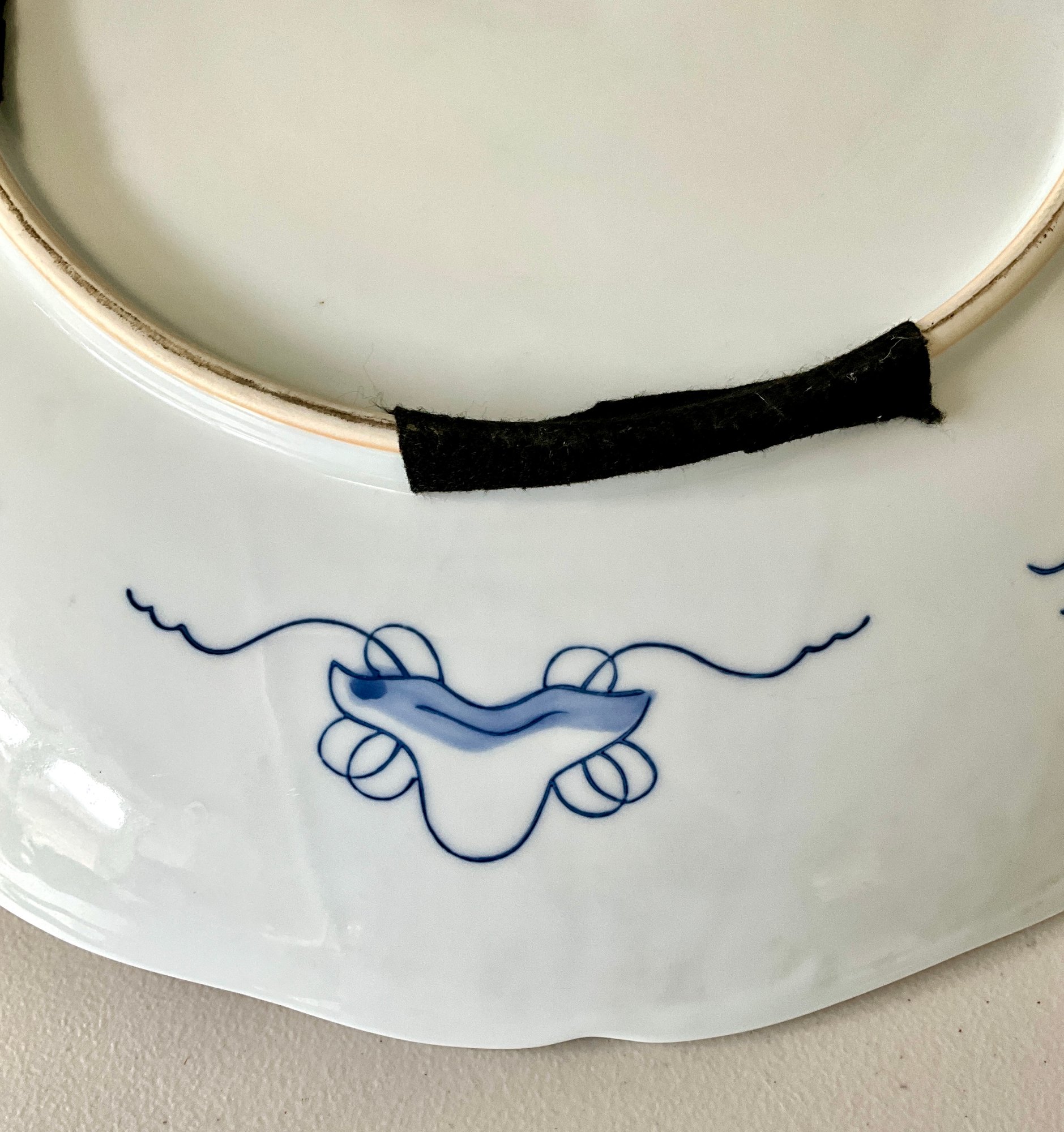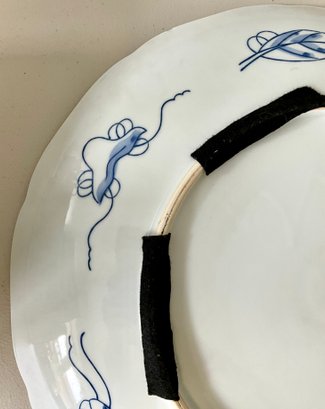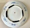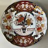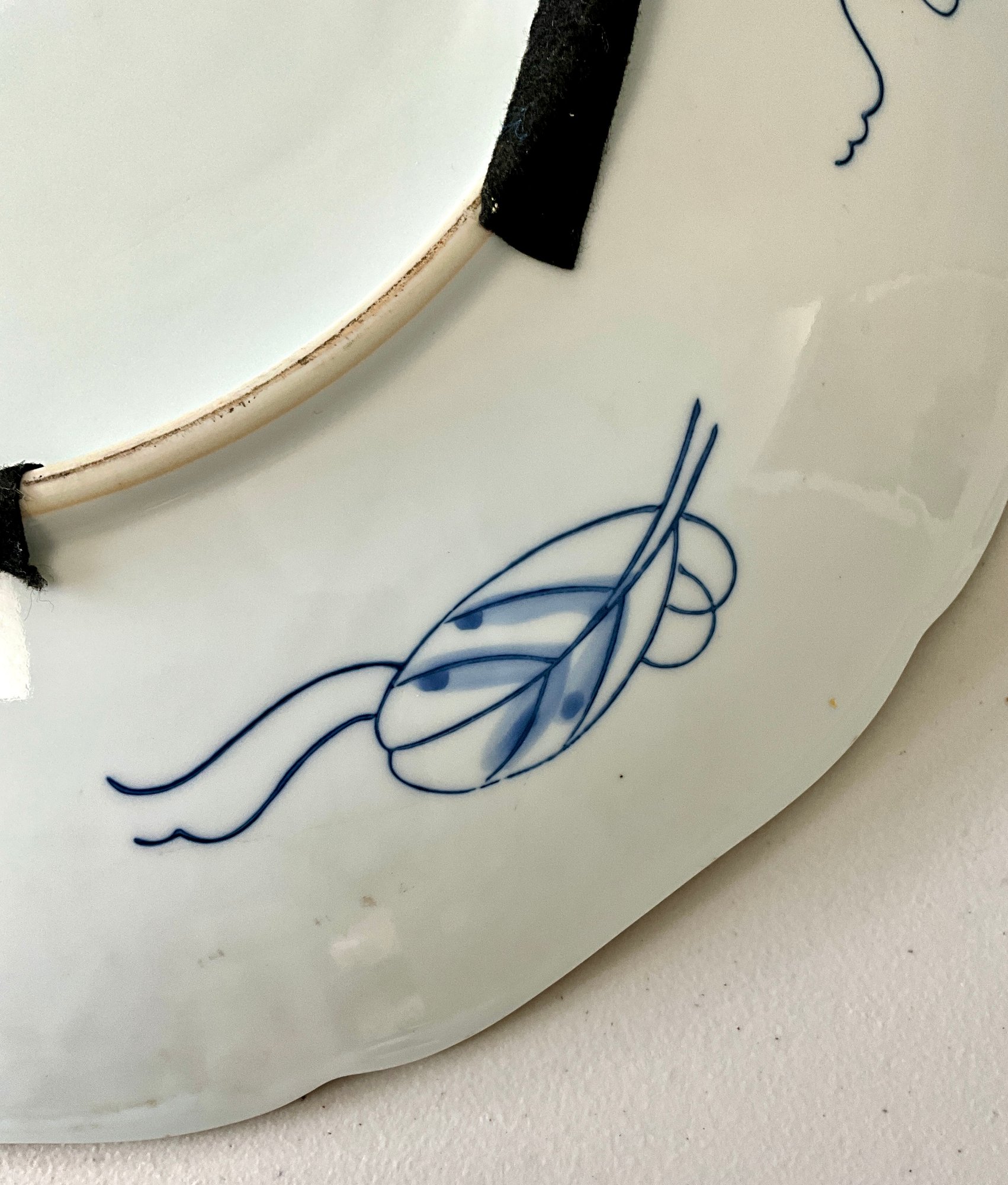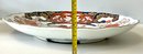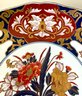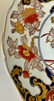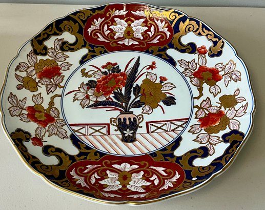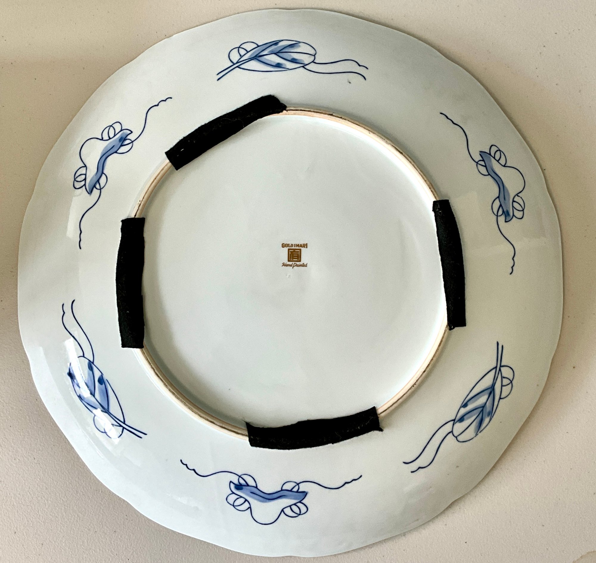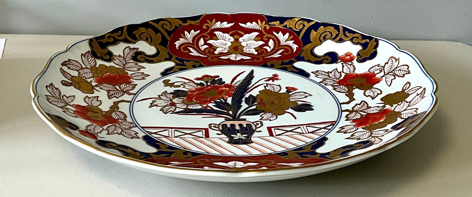 The large antique Japanese Imari plate is a fine example of quality Imari porcelain, featuring a scalloped edge. Its central design showcases a basket of flowers, surrounded by hand-painted flowers and leaves in red, blue, green, and white colors.